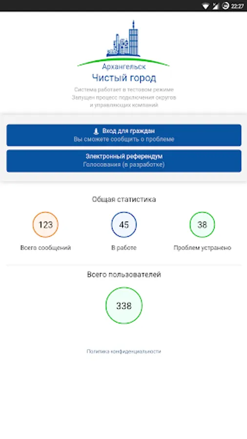 Web - service "Clean City" - a convenient and affordable tool for interoperability ordinary residents of the city of Arkhangelsk City Administration and local authorities. It is designed to fix the violations of harvesting areas, illegal inscriptions or figures, road traffic violations or sidewalk coverage (currently most of the categories are temporarily closed).