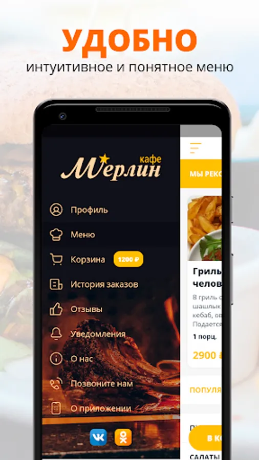 Cozy family cafe with author's cuisine. We cook perhaps the best pizza and delicious barbecue. We can offer a variety of dishes for a business lunch, there is a children's menu, a grill menu. See the menu and place an order for delivery or self-delivery of food from the Merlin cafe!