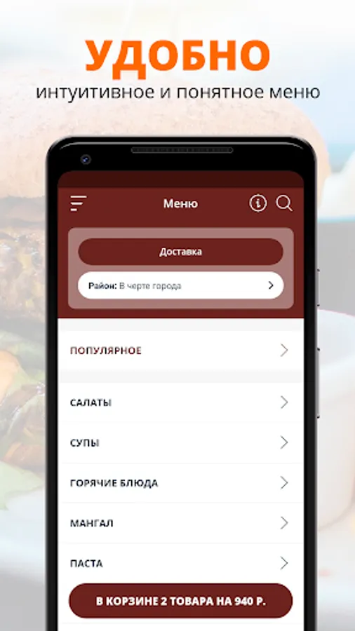 Install the app, choose your favorite dishes from our menu and place your order in just a few clicks! Also in the application you can receive and save bonuses, track the status of your order, choose a convenient payment method and keep abreast of all promotions and news!