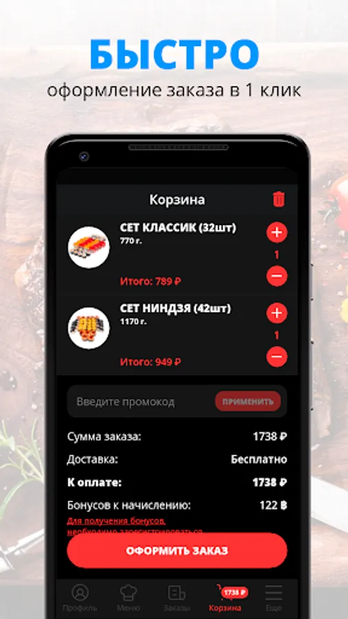 You can order cheap sushi from us! Flexible discount and bonus programs, as well as periodic promotions allow us to keep our regular customers.