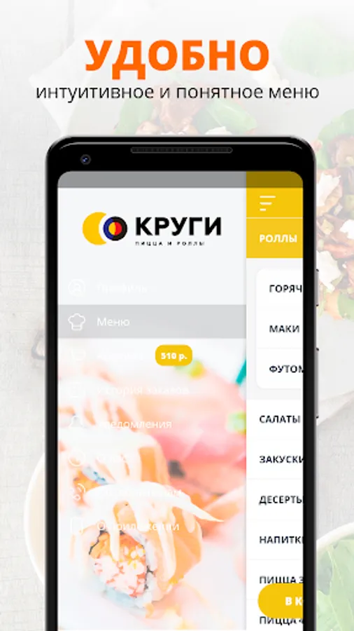 Circles application | Mytischi is a convenient way to order food at home or in the office. Always on our menu are delicious rolls, pizza, salads.