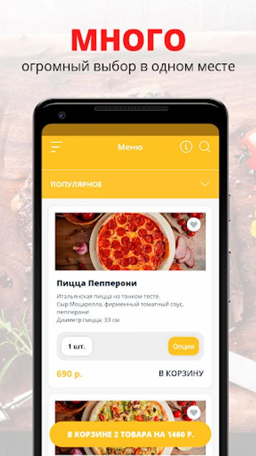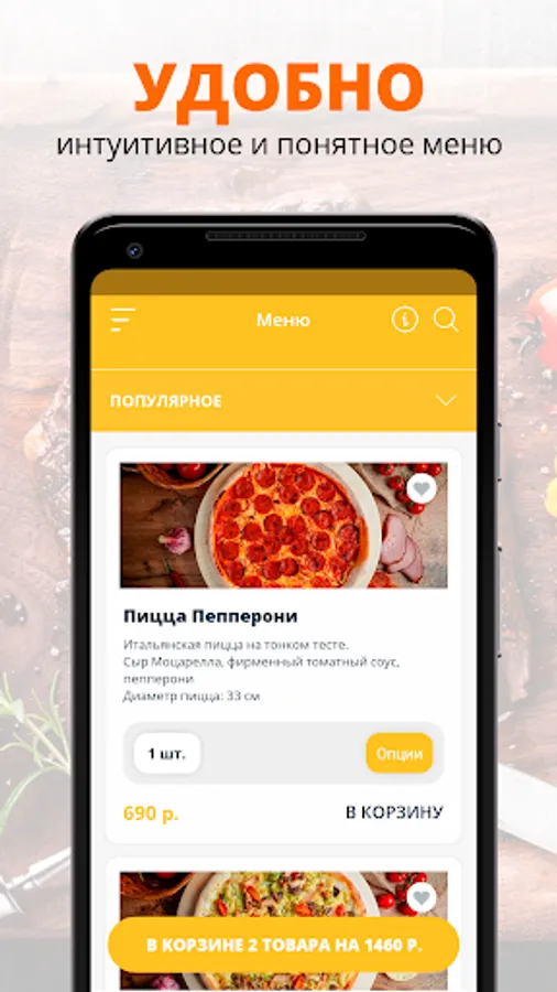 Use the convenient application for ordering food from the delivery service "Pizza in the area".