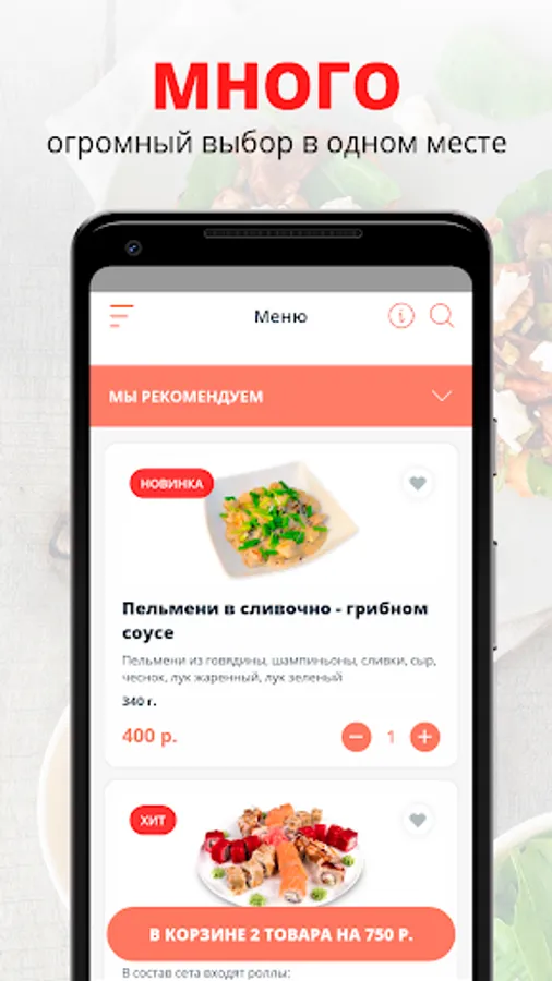 Always on our menu: juicy pizza, sushi and rolls, first and hot dishes, salads, snacks, desserts, drinks. Delivery is carried out free of charge within the city, within 59 minutes, when ordering from 500 rubles.