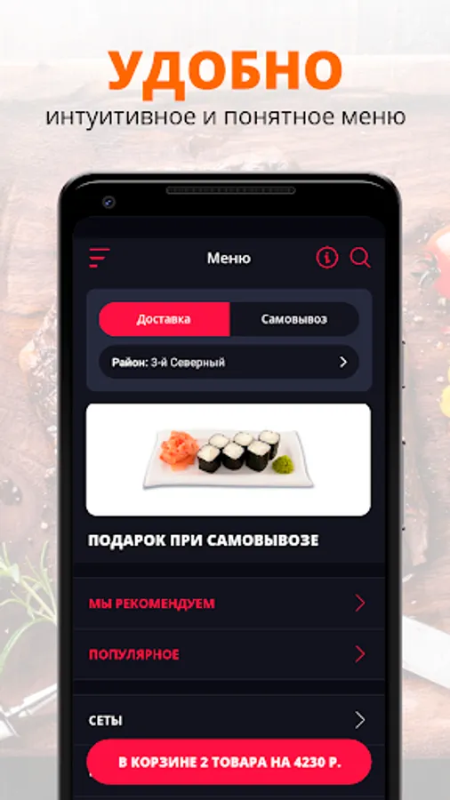 In the FishKa Roll application, you can easily order sushi, rolls and pizza with delivery in Severouralsk and villages daily from 11:00 to 22:00.