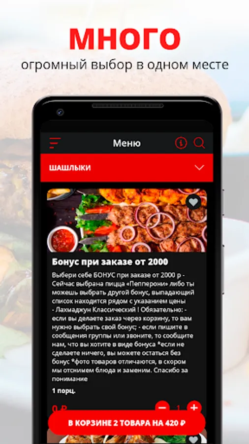 Order your favorite dishes from us and you will be satisfied with the quality of service. Always on our menu: barbecue, pizza, Japanese cuisine, wok noodles and much more! Fast food delivery in Togliatti!