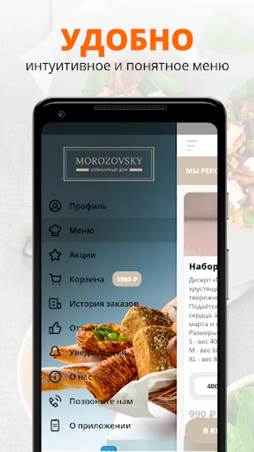 The Morozovsky app is a convenient way to order food to your home or office! We prepare our meals with quality fresh ingredients and deliver food quickly and gently.