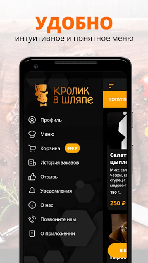 The Rabbit in the Hat app is a convenient way to order food to your home or office! We prepare our dishes from high-quality fresh ingredients and deliver food in the Vsevolozhsk region quickly and carefully.