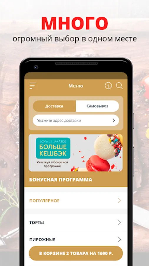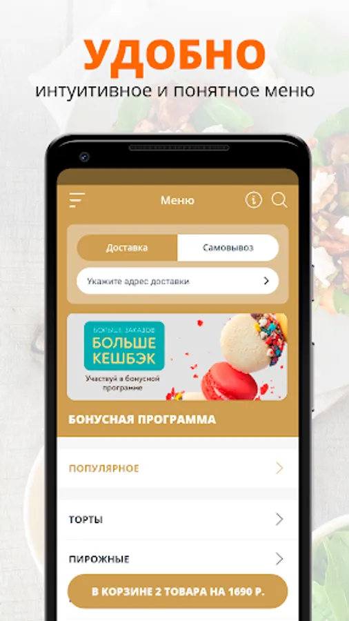 In our mobile application you can order confectionery products with home delivery! Install the application, select your favorite dishes and products from the catalog and place an order in a couple of clicks!