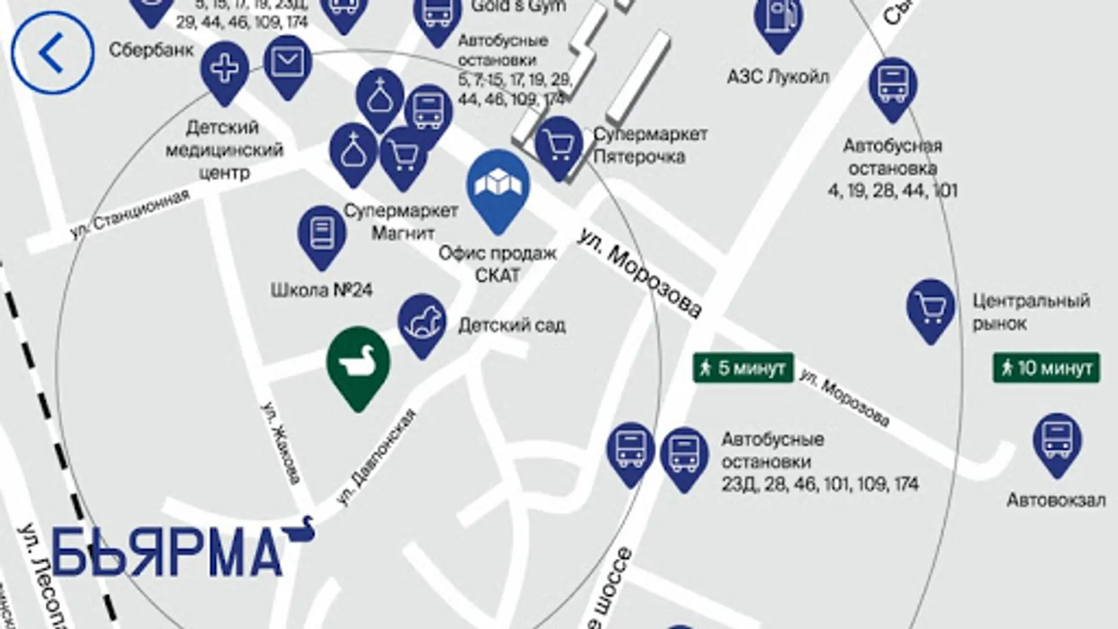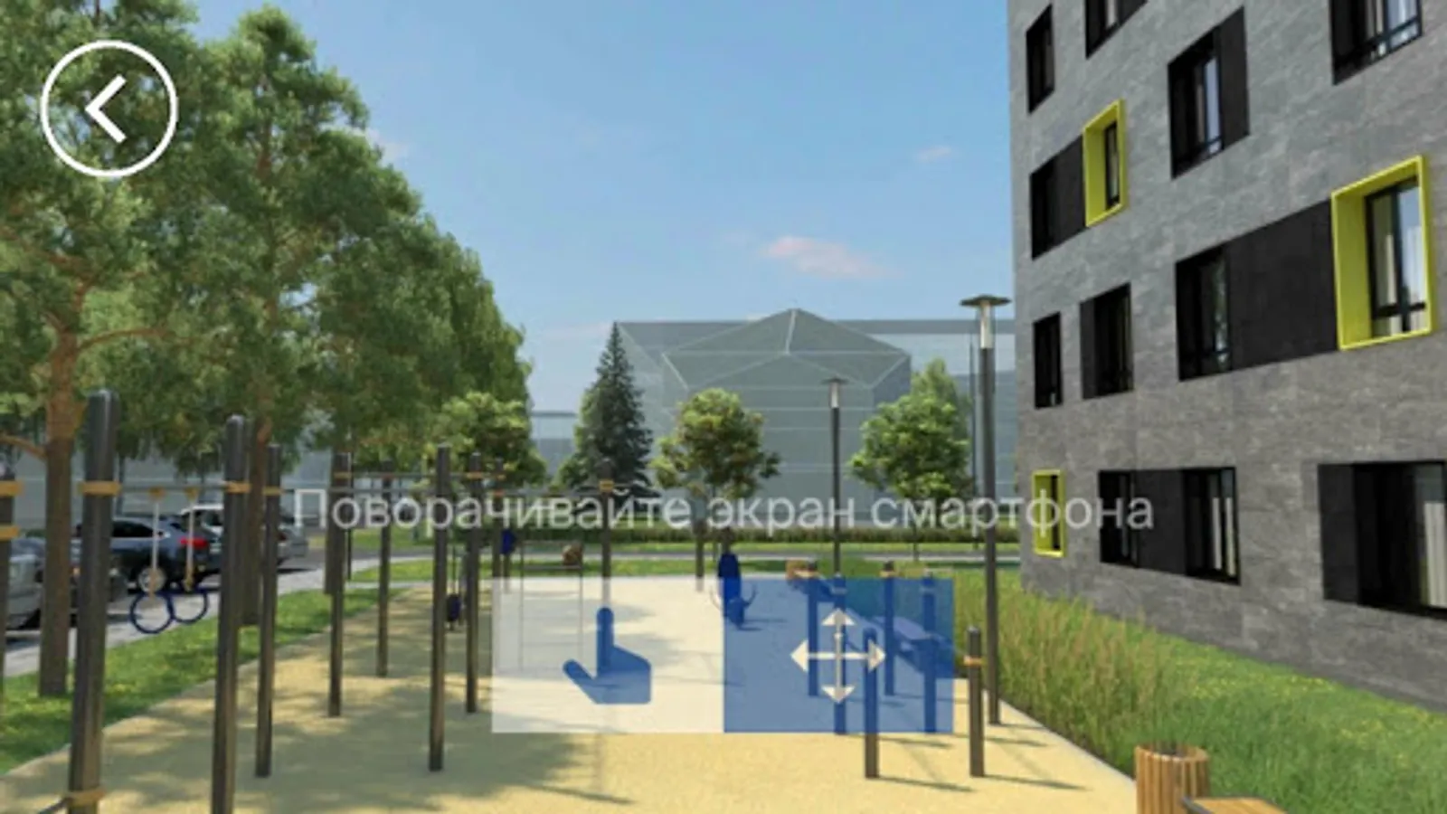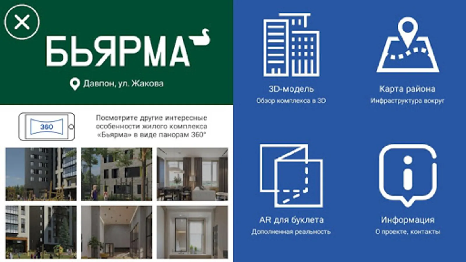 Overview of the Bjarma residential complex of the SKAT construction company in augmented reality (AR) mode and 360 ° panoramas, as well as a map of the infrastructure around and contact information.