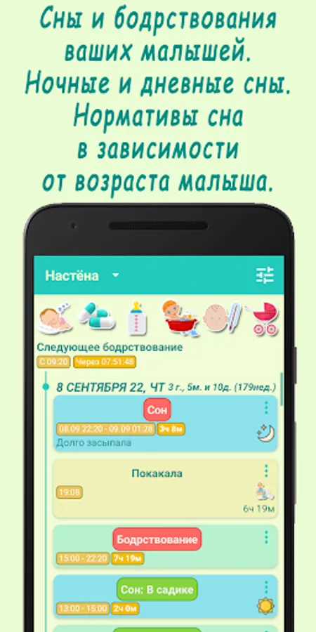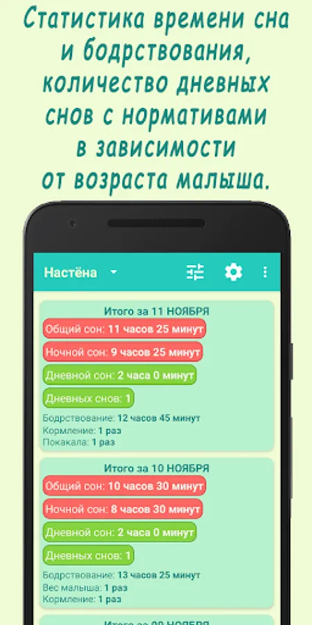 Convenient application for keeping the baby's sleep time, feeding the baby. View baby's daytime sleep and nighttime sleep.