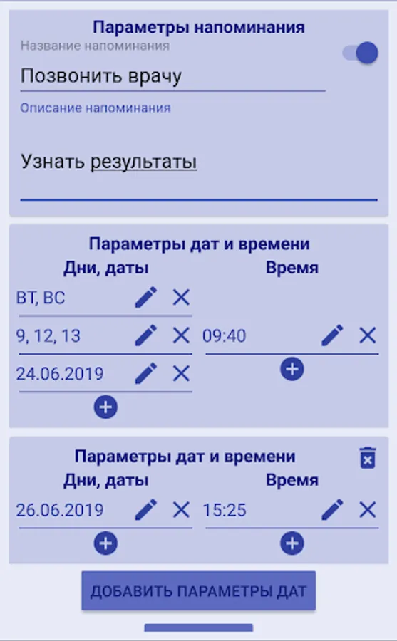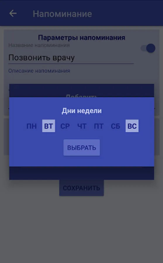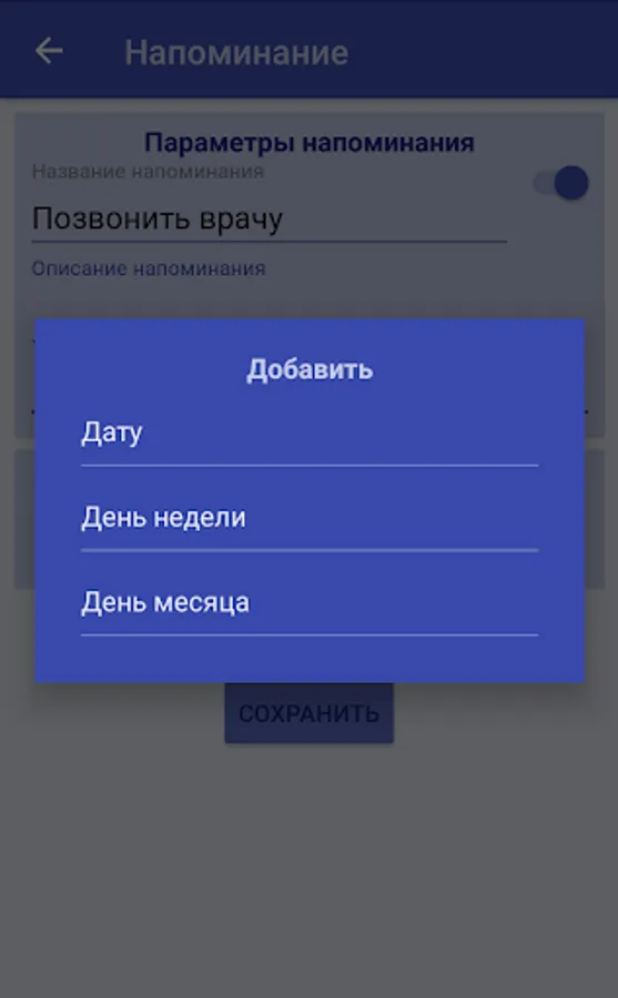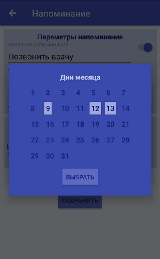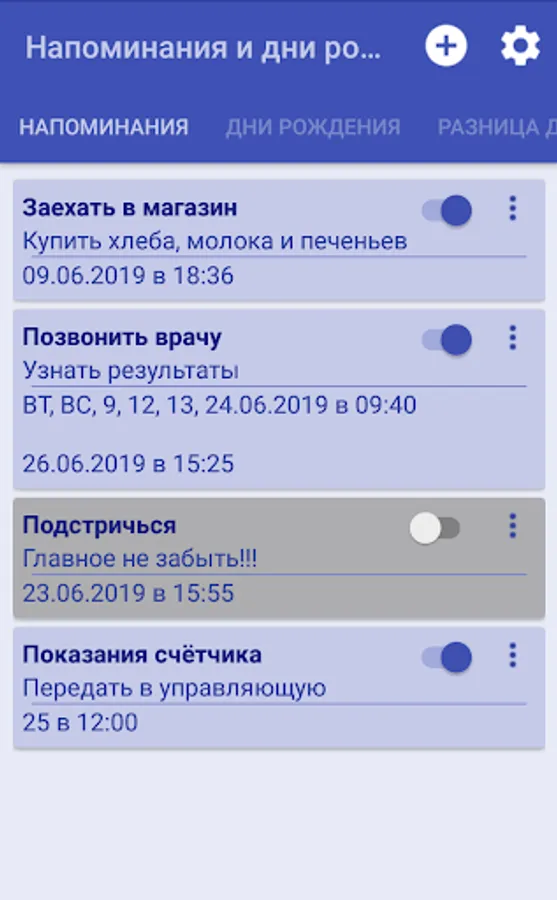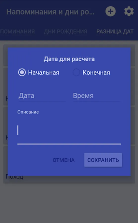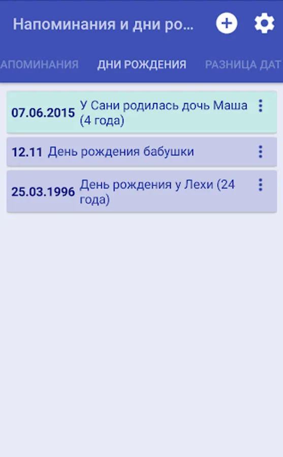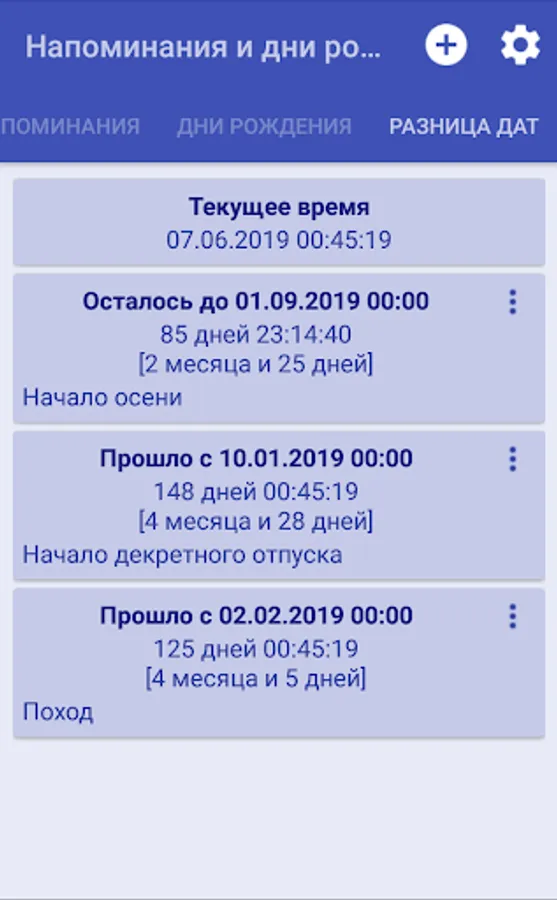 The simplest application is a reminder. Allows you to start events for reminders at the right time, as well as keep a list of the birthdays of your friends. Additionally, you can configure the counter days to date (how many) or from the date (how many have passed).