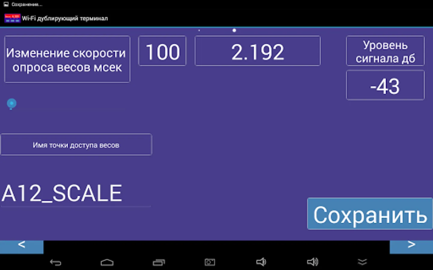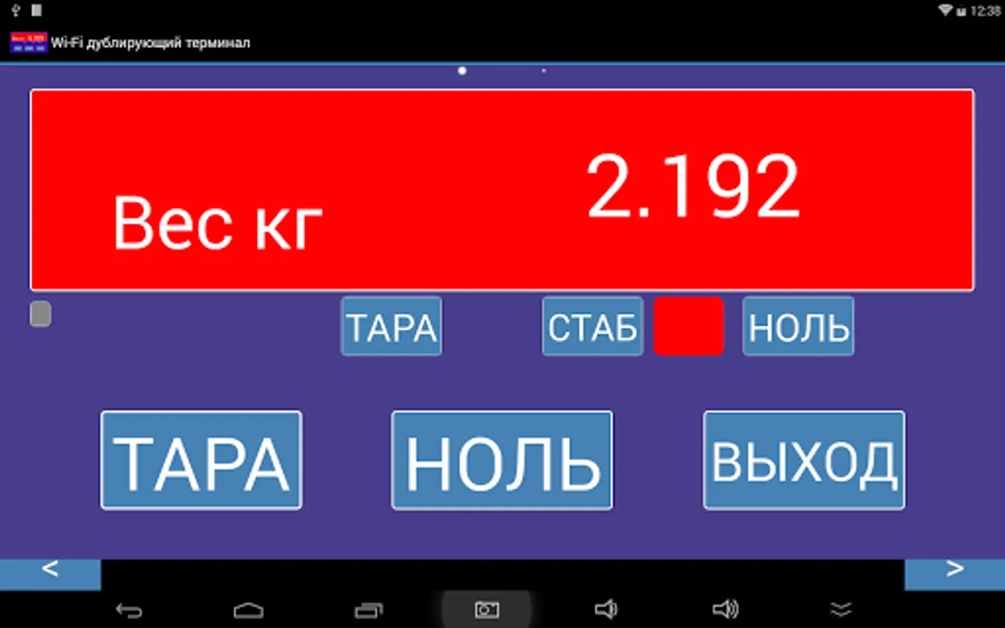 The Duplicate Terminal application serves to duplicate the display of the product weighing process on the screen of a tablet computer or smartphone. The application can be installed on a tablet computer or smartphone with the Android operating system version no lower than 4.4.2. This application is designed to work with weight indicators or table scales manufactured by Middle, which are equipped with a Wi-Fi module and support a command protocol for serial communication.
