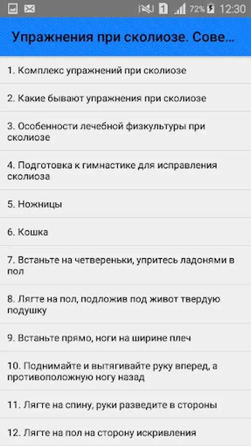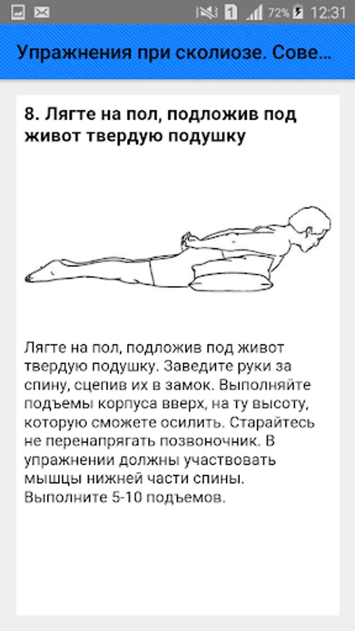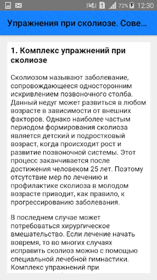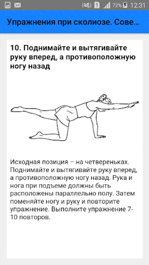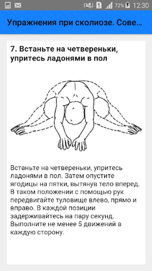 Scoliosis is a lateral curvature of the spine, which is possible in all its departments and in any direction. Already in the initial stage of the disease, the internal tension in the vertebral bodies and discs increases sharply. The spine becomes stiff, inflexible. The pathological processes are developing at an accelerated pace. The ability of the spine to withstand a variety of overloads is reduced. One of the most effective methods of treating scoliosis in the initial stages of the disease is exercise therapy (physical therapy). Therapeutic exercises for scoliosis should be performed very smoothly and gently. Sudden movements should be excluded. This will prevent injury to the spinal column and intervertebral discs.