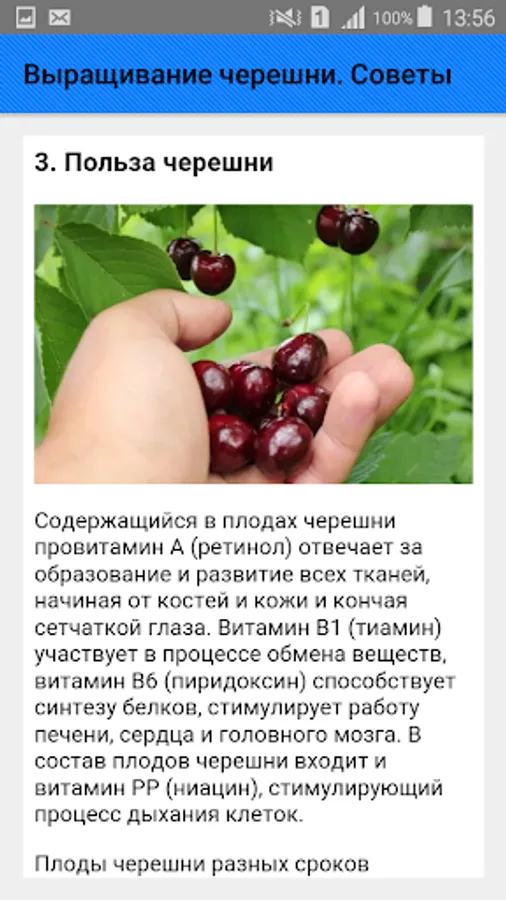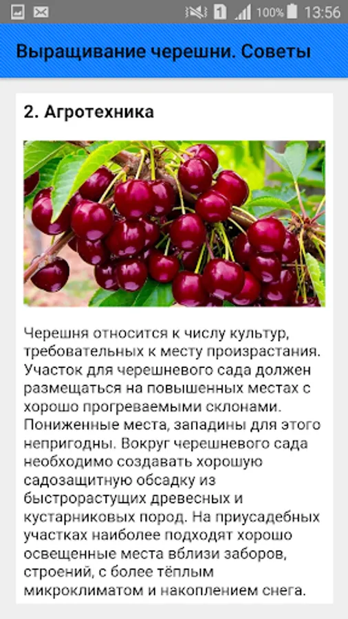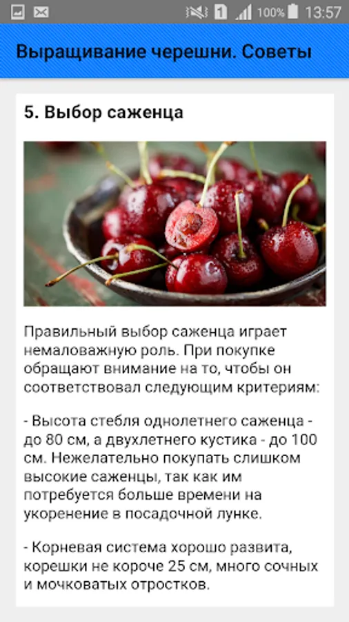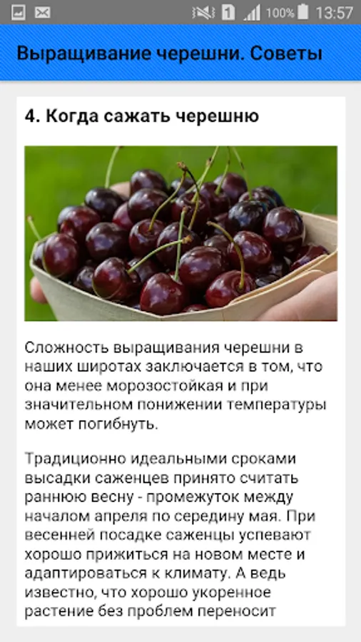 Cherries are much less likely to get sick, unlike cherries, but they do not survive winter well. The biggest problem gardeners face when growing cherries is their rapid growth. The tree grows in height of a three-story house, and begins to bear fruit five years after planting. Sweet cherry is considered a rather capricious culture. It is necessary to carefully select an open sunny and windless plot with fertile soils. Cherry may die on waterlogged soils, and freeze on sandy soils. In general, the planting of sweet cherry seedlings does not differ from the planting of other crops, and will be the same in spring and autumn. The main thing is to prepare the landing pit in advance, not to deepen the root neck and carefully water the tree after planting.