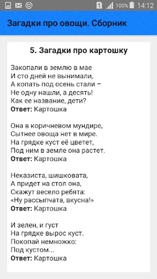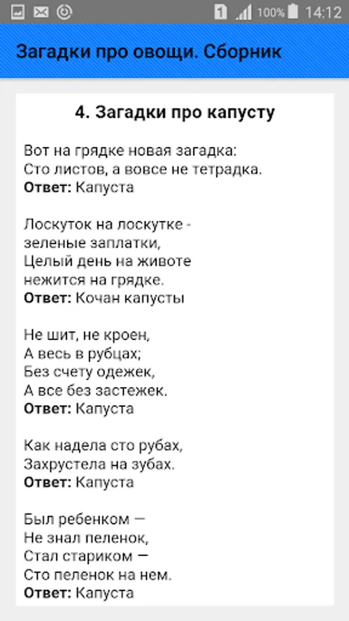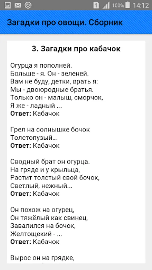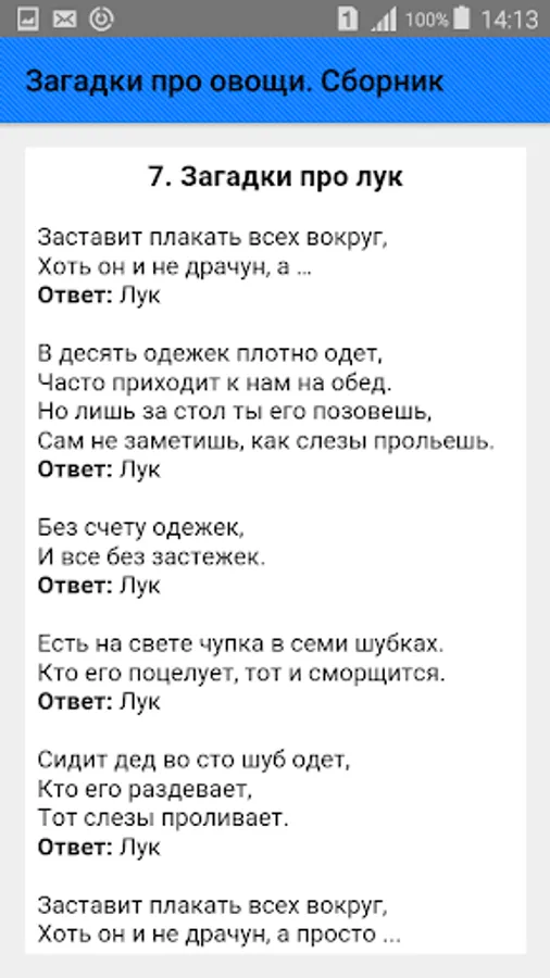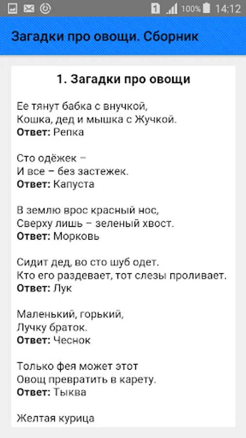 A collection of riddles about vegetables for all occasions is presented in a wide variety: about cabbage, carrots, potatoes, onions, garlic, beets, pumpkins, tomatoes, cucumbers, turnips, radishes, radishes, zucchini, squash, eggplant, peas, beans, peppers, corn , parsley, dill and others.