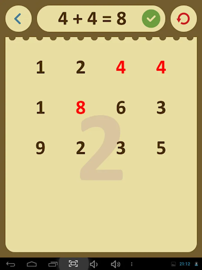 The game is to clear the field of numbers, figures by folding (Example establishment) and its solutions. Remains unchanged and equal to plus. For example, in the figures 7512, press 7, then 5, write the answer 12. Get a worked example. Level is passed!