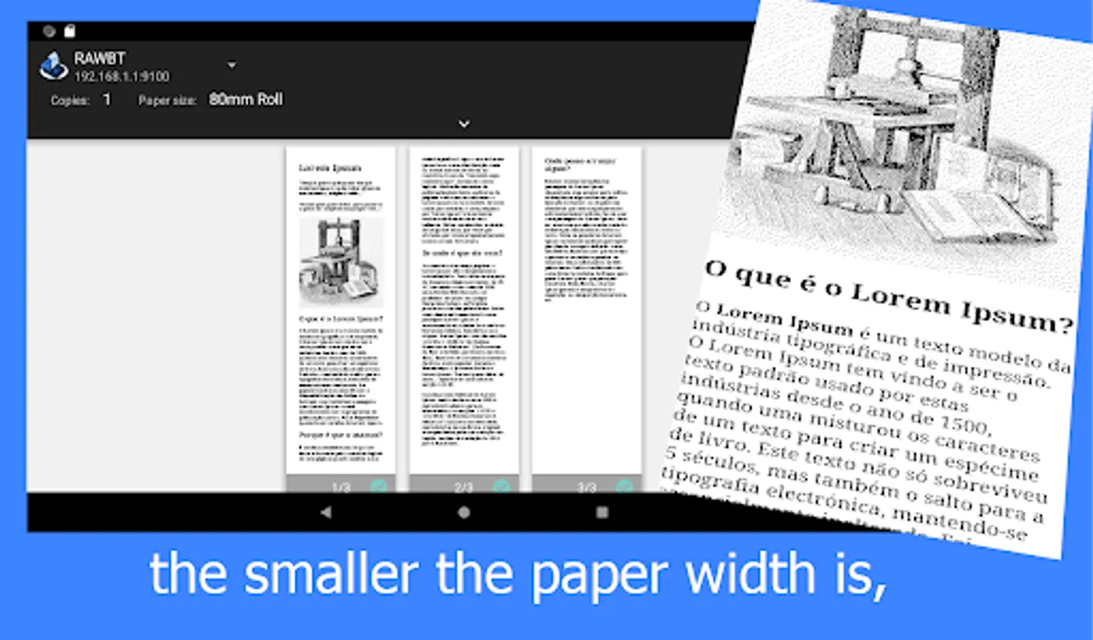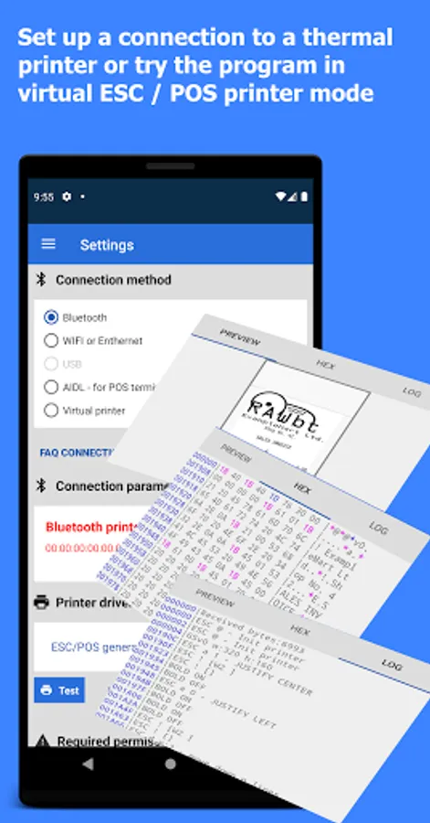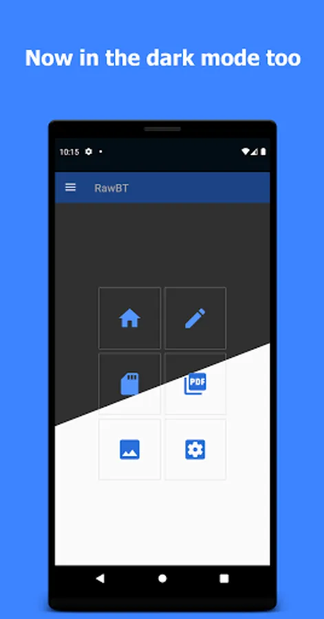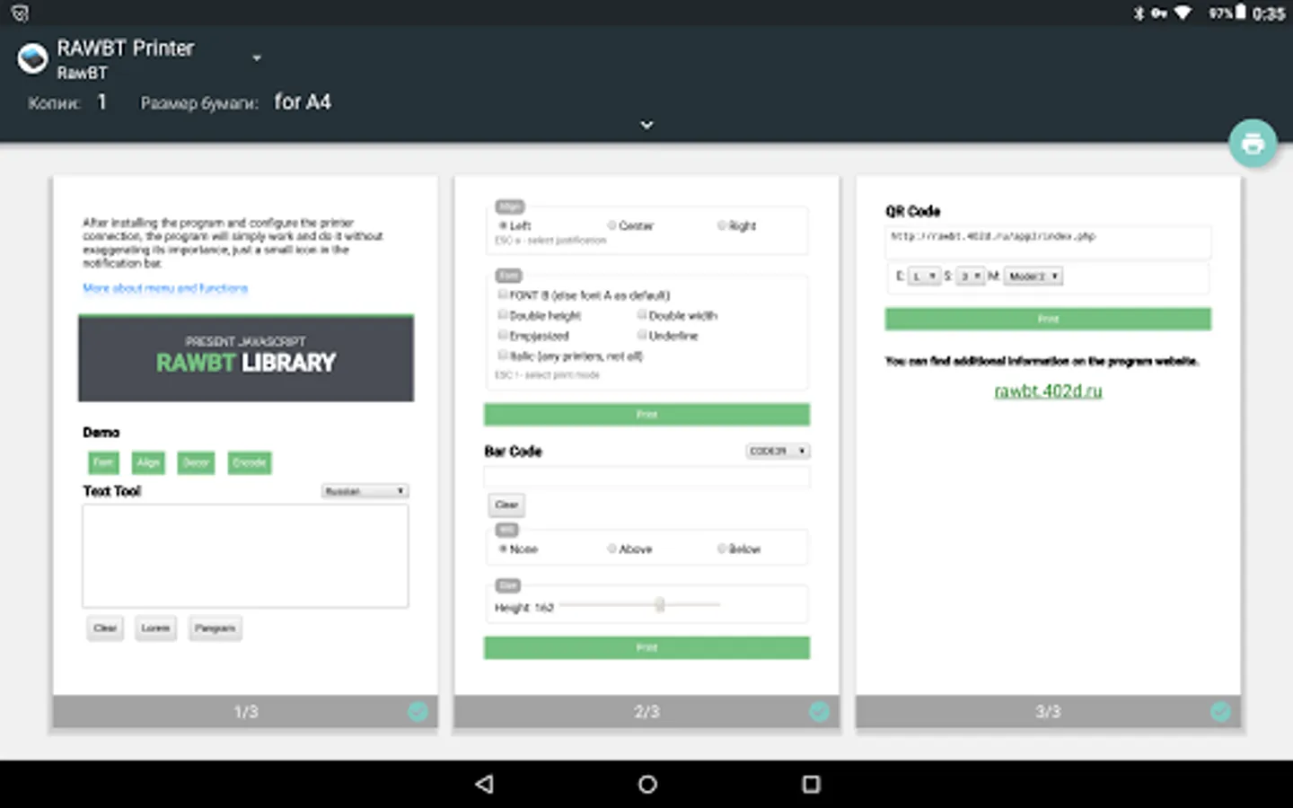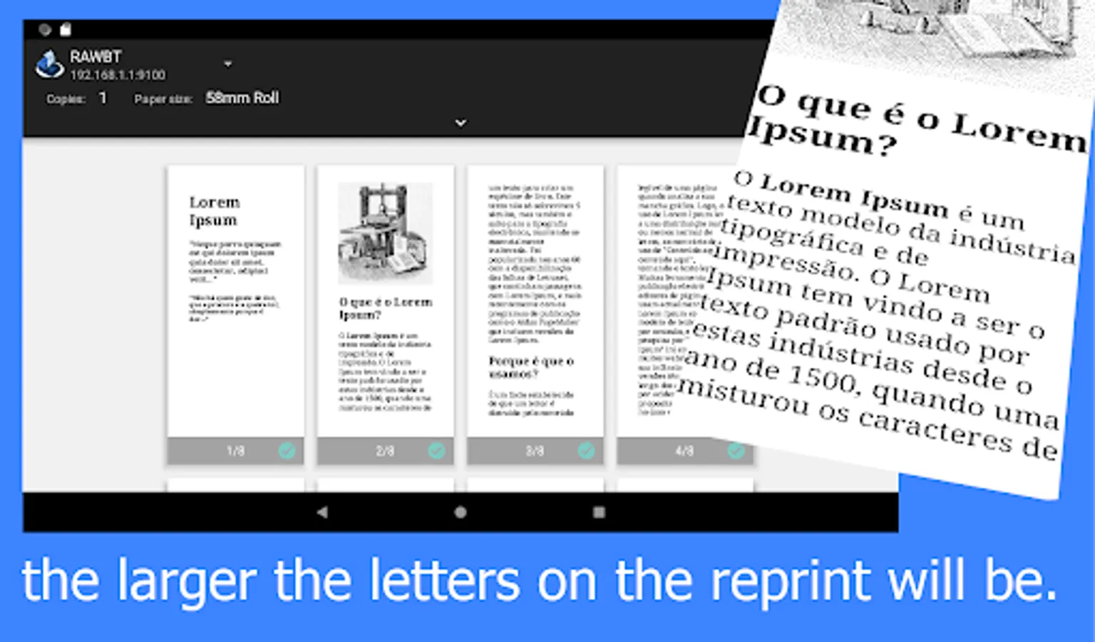 Find menu items "print", "share", "send" or "open" in any app, click and select RawBT.