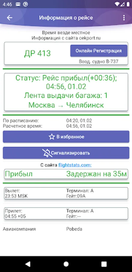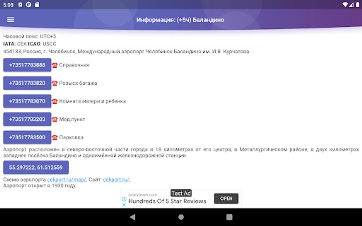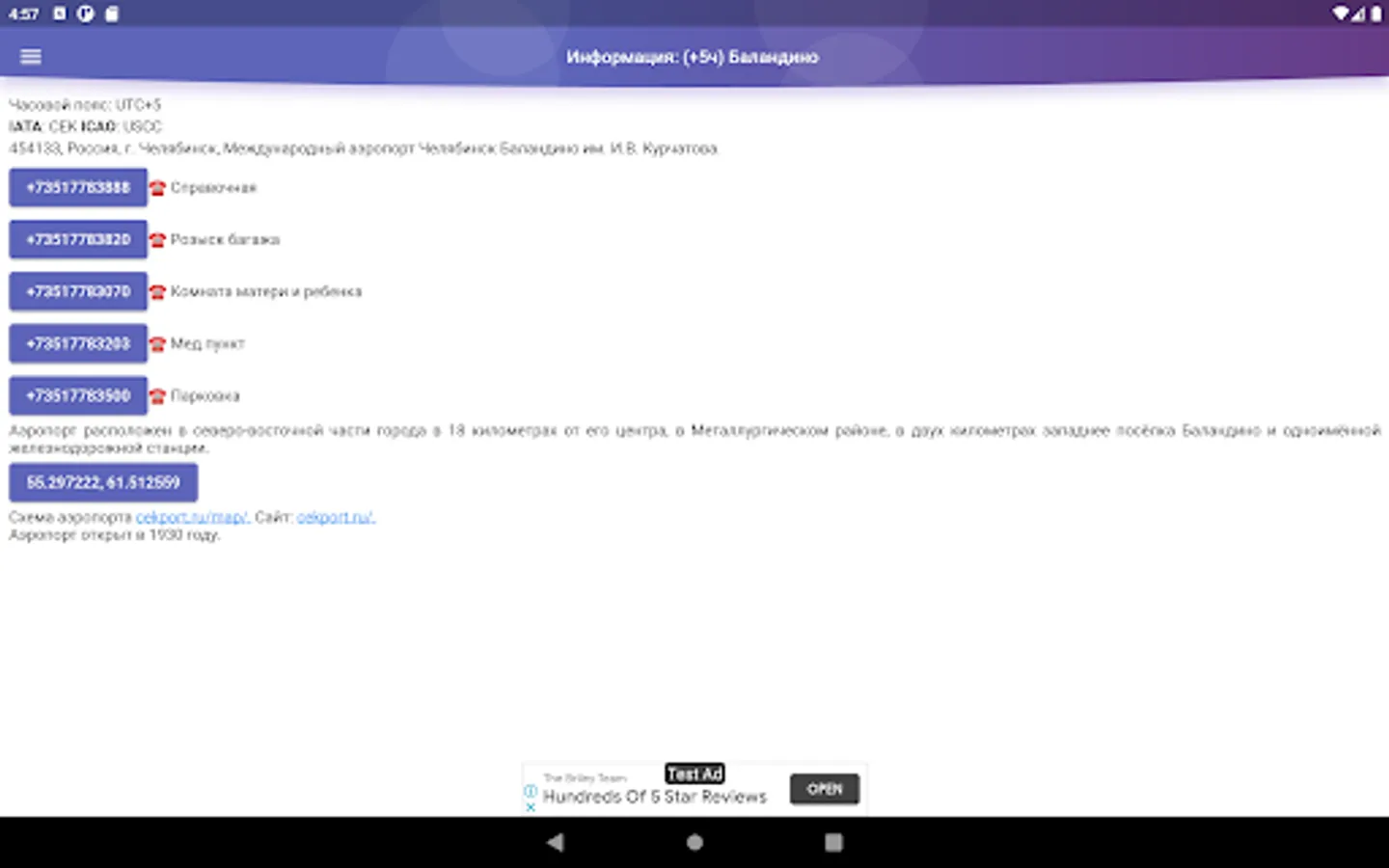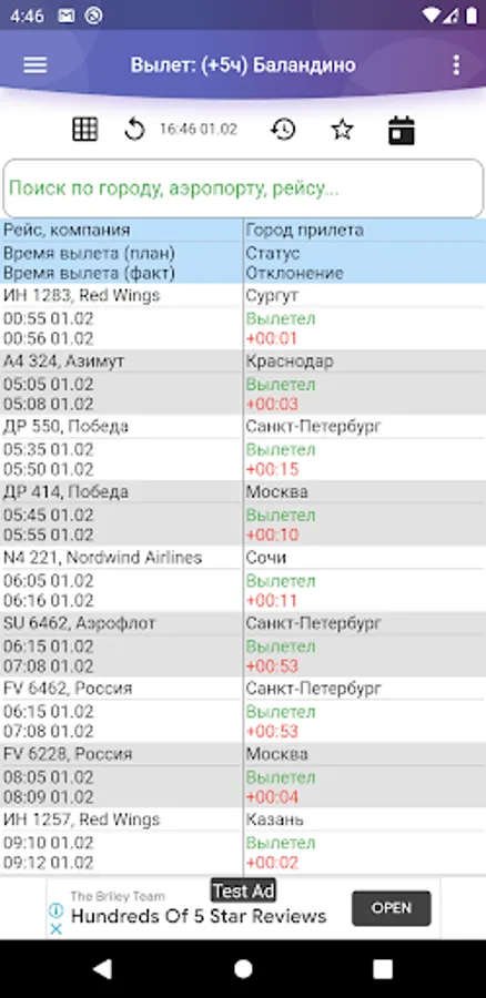 Unofficial application of Balandino Airport (Chelyabinsk), providing information on flight status (departure/arrival). Schedule, contact and other information. It is possible to expand the scoreboard row into an extended data screen.