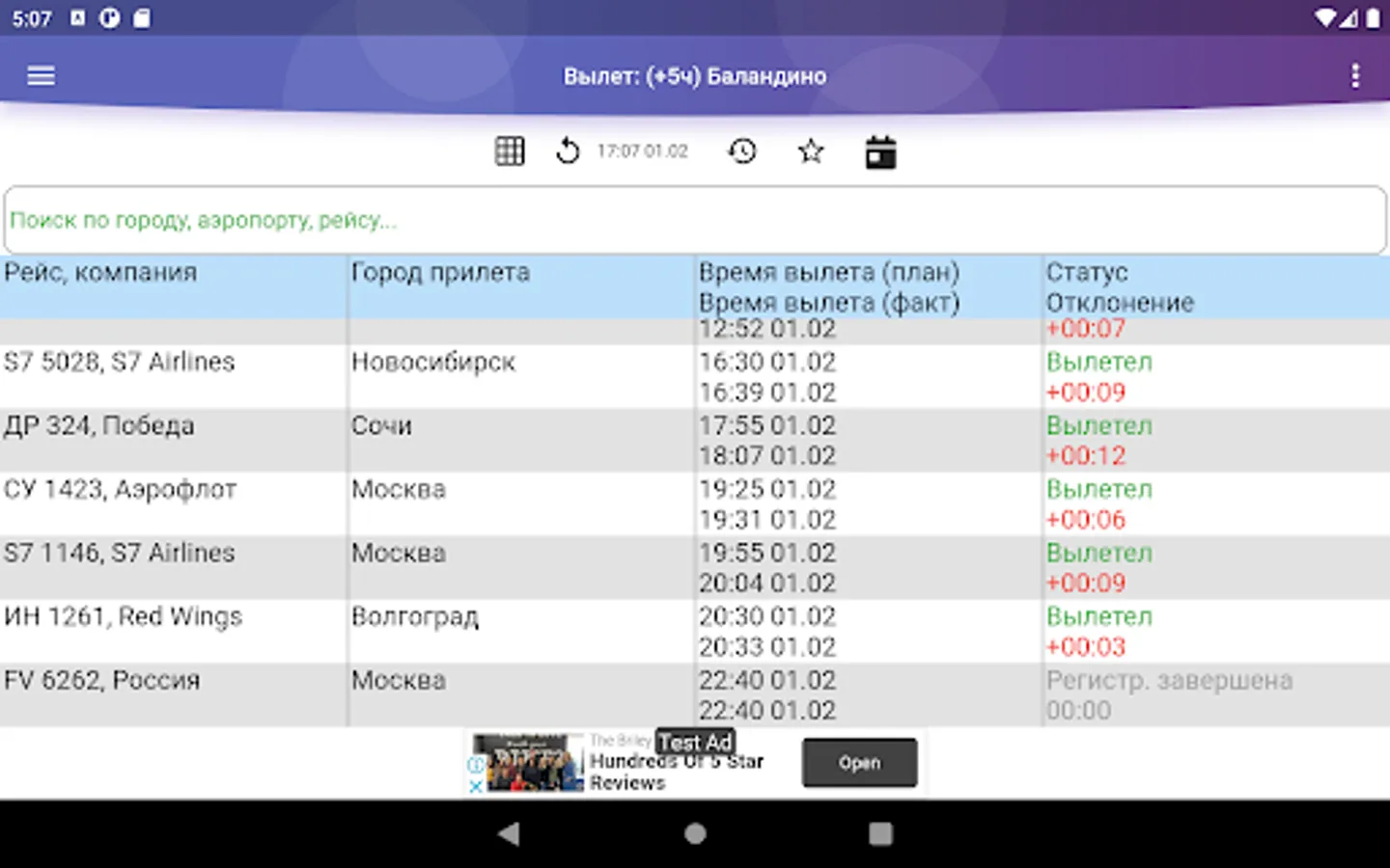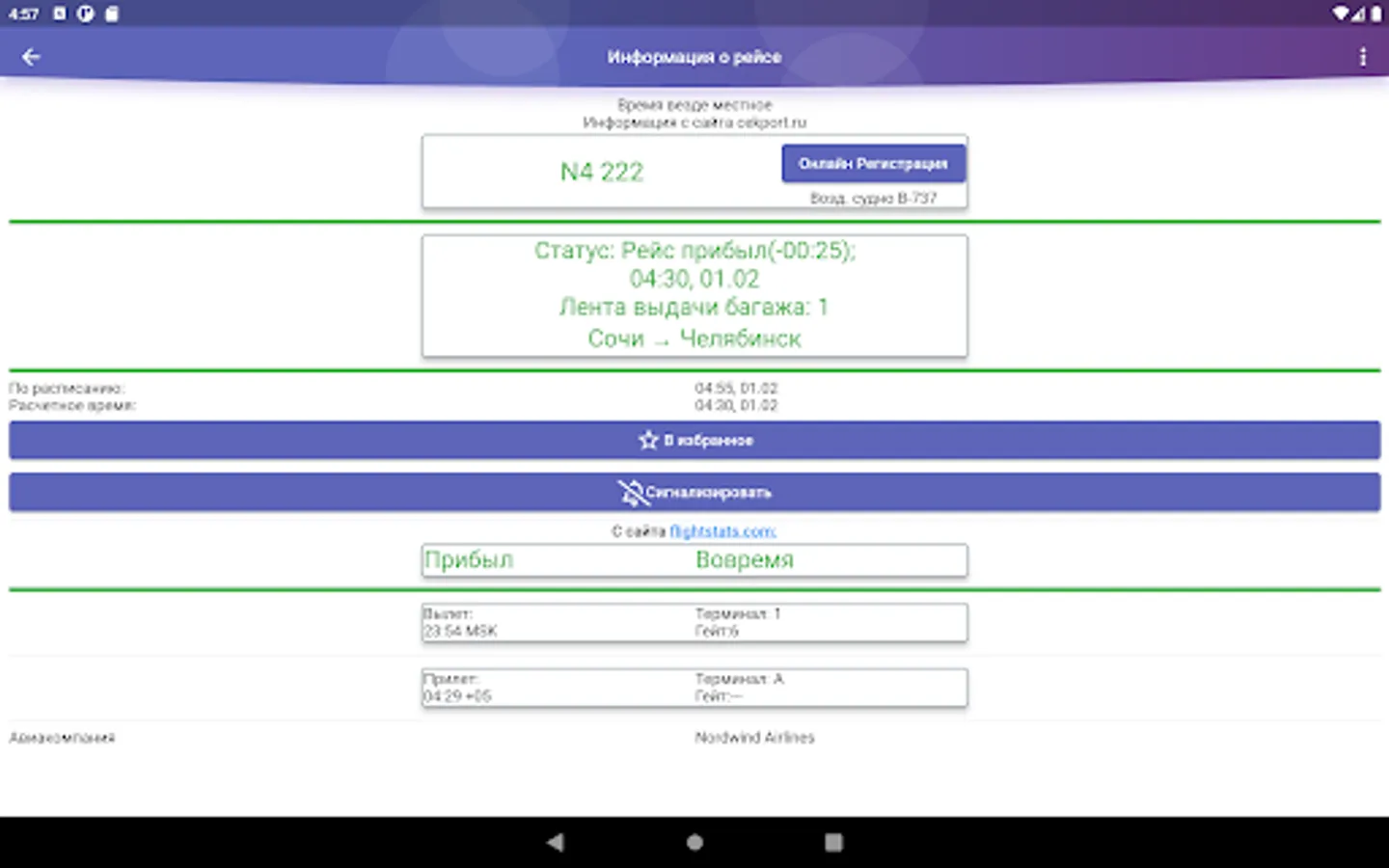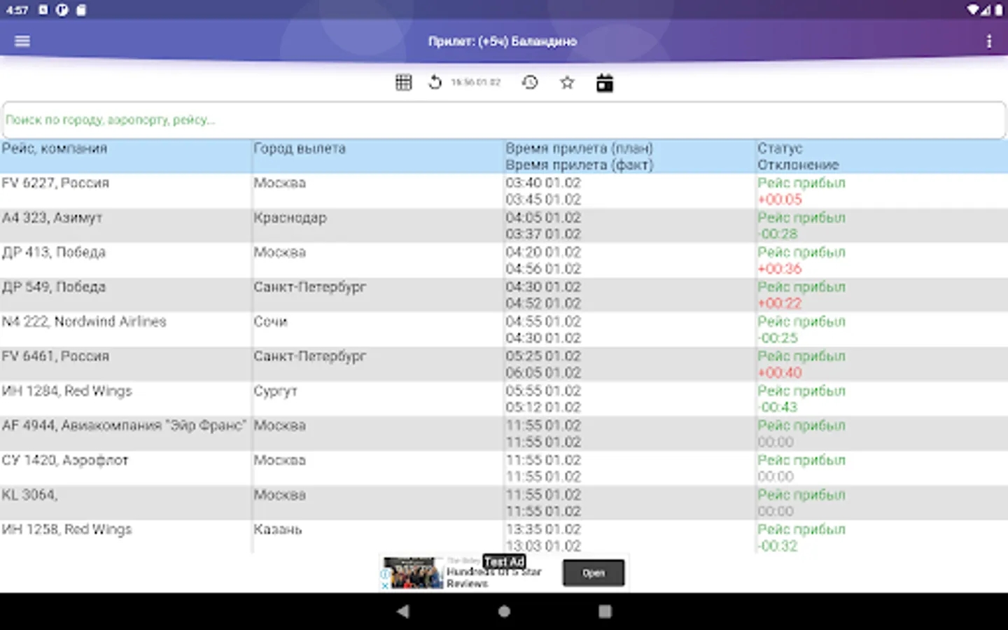 Unofficial application of Balandino Airport (Chelyabinsk), providing information on flight status (departure/arrival). Schedule, contact and other information. It is possible to expand the scoreboard row into an extended data screen.