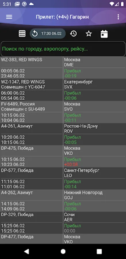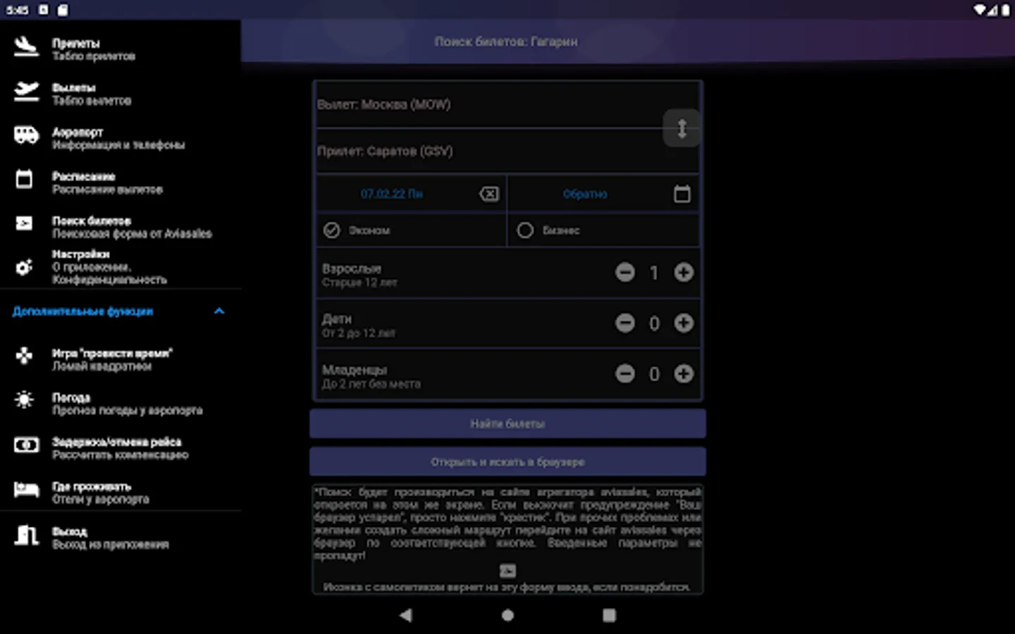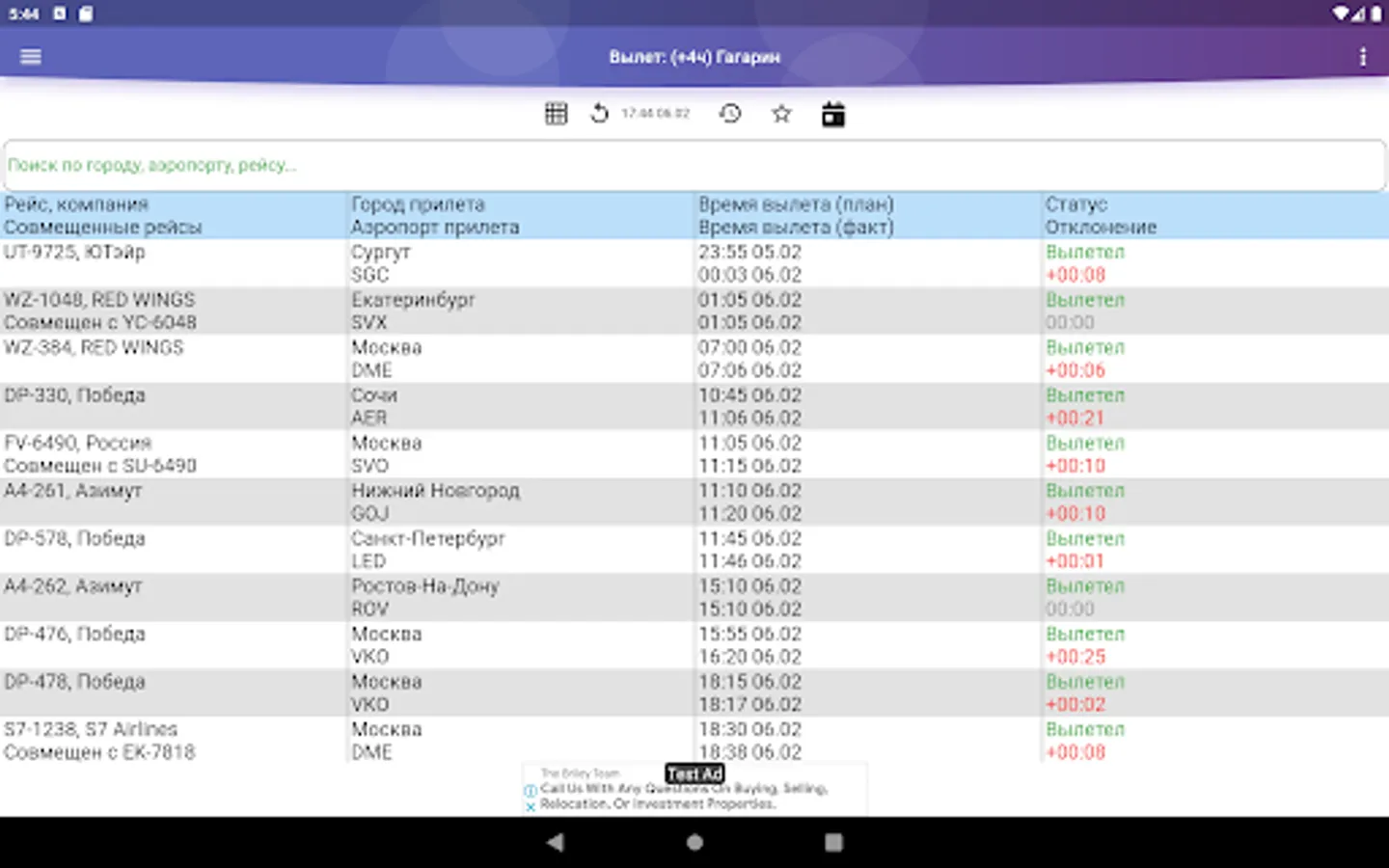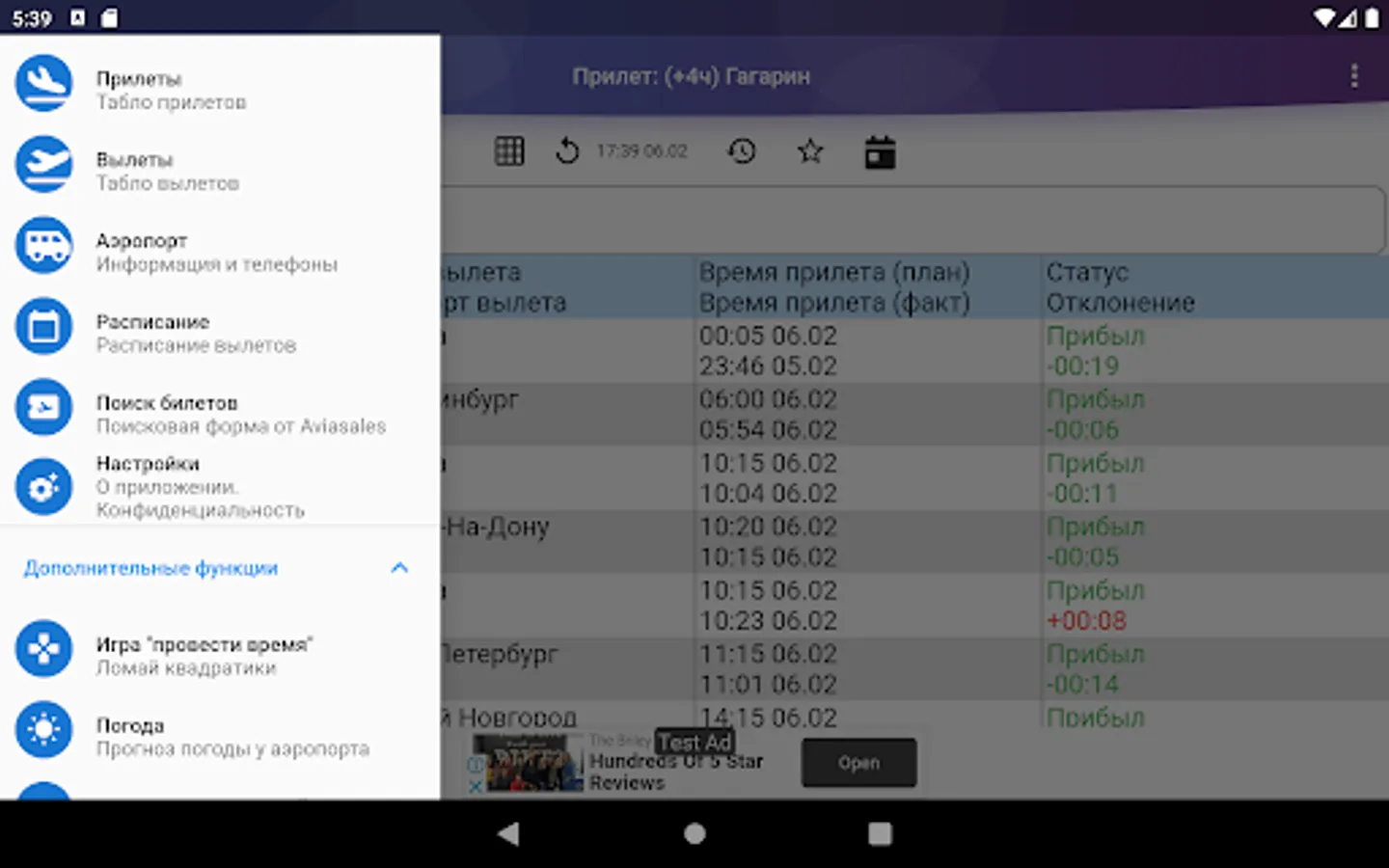 An unofficial application of Gagarin Airport, providing information on the status of departures and arrivals of aircraft. More flight schedules and other useful information. It is possible to expand the scoreboard line into an extended information screen.