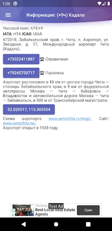 - phones and coordinates of the airport