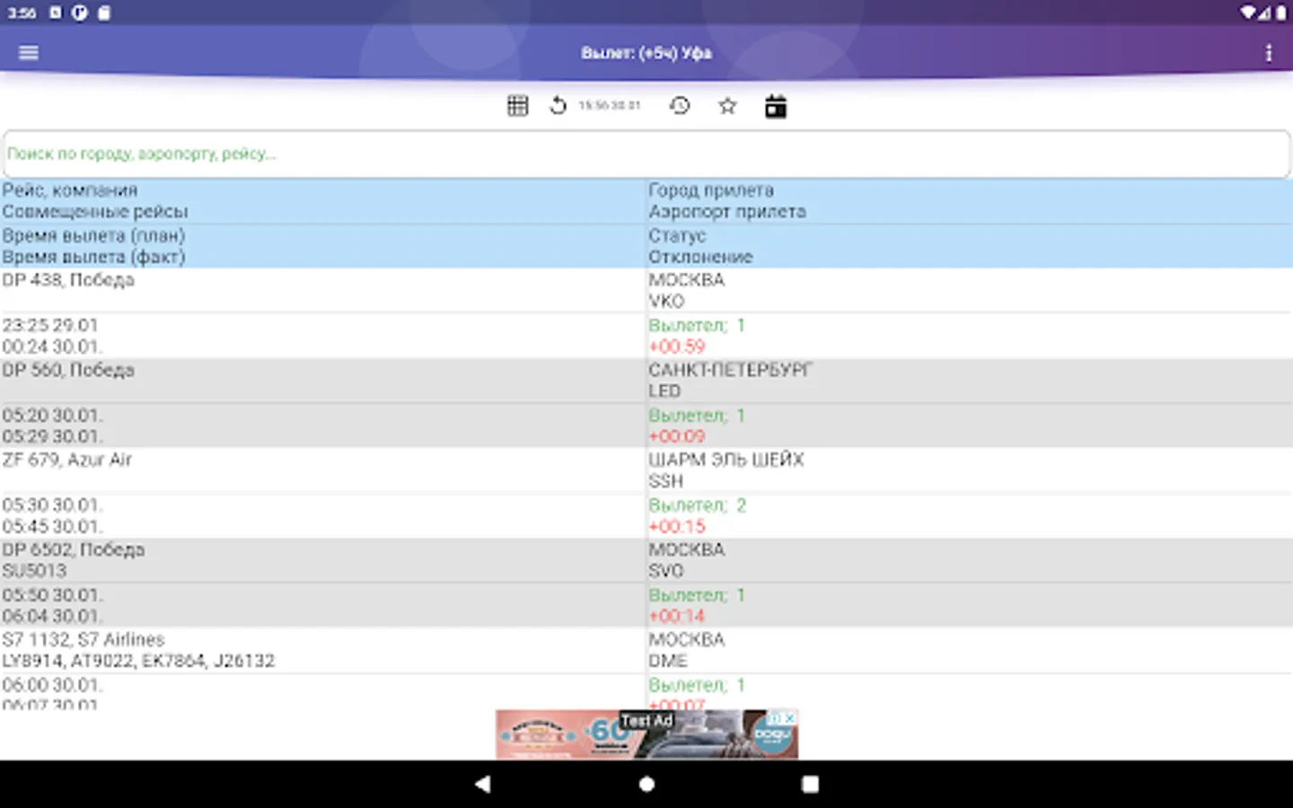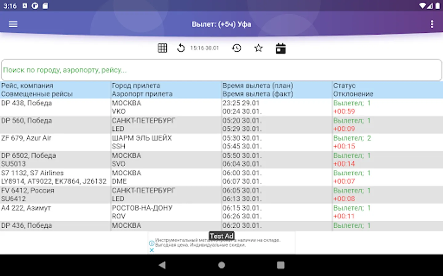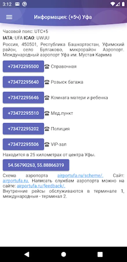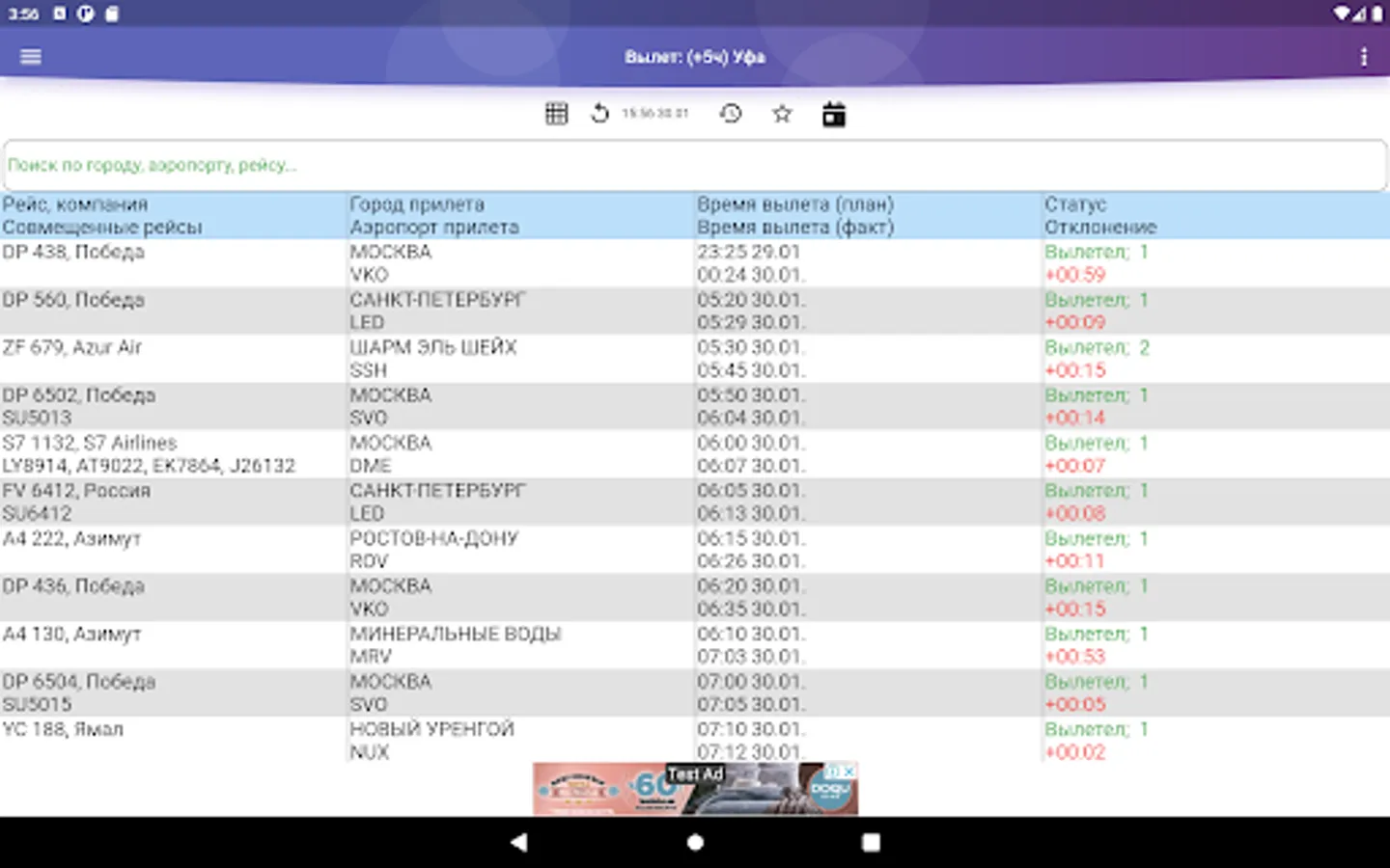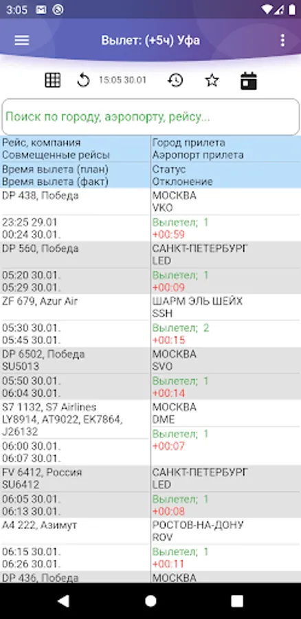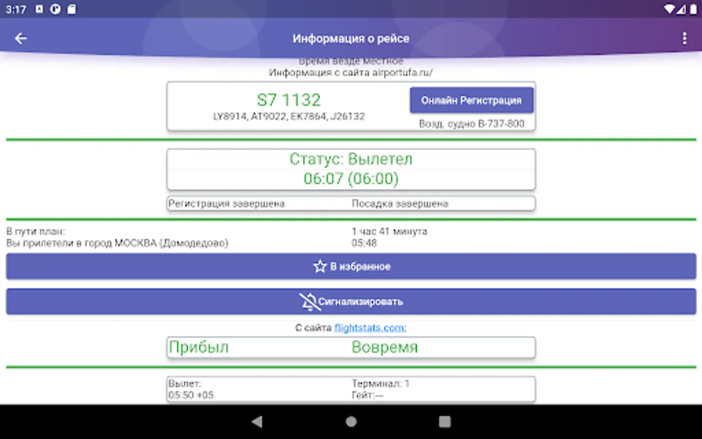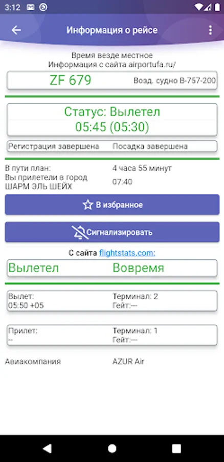 √ INFORMATION from the website airportufa.ru/: flight status, time of actual departure or arrival, exit numbers