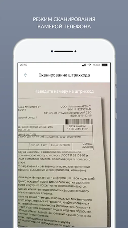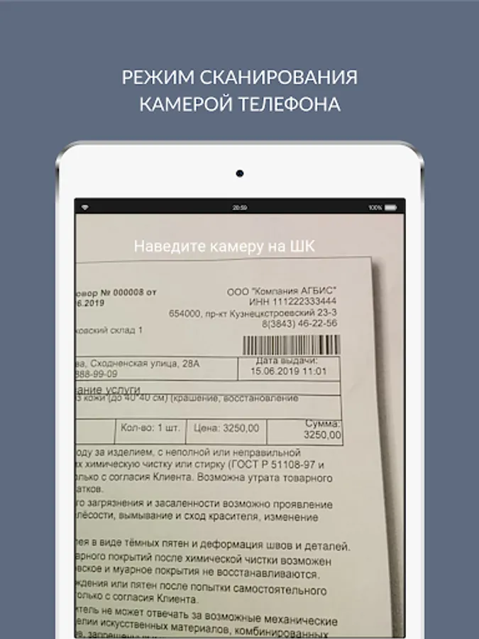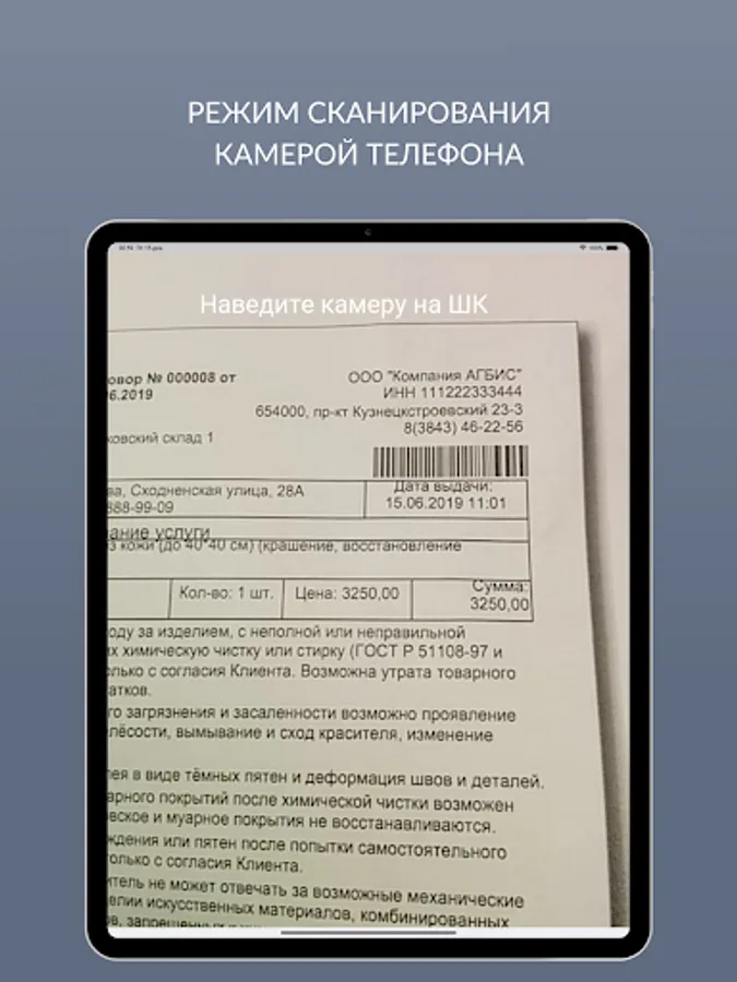 This mobile application was created for personal services that work with the software package of the company AGBIS. The Agbis Scanner application allows a dry-cleaning worker at the receiving point to scan barcodes using his mobile phone and transmit the data to the AGBIS software system. Scanning is performed using the built-in smartphone camera or using a usb scanner.