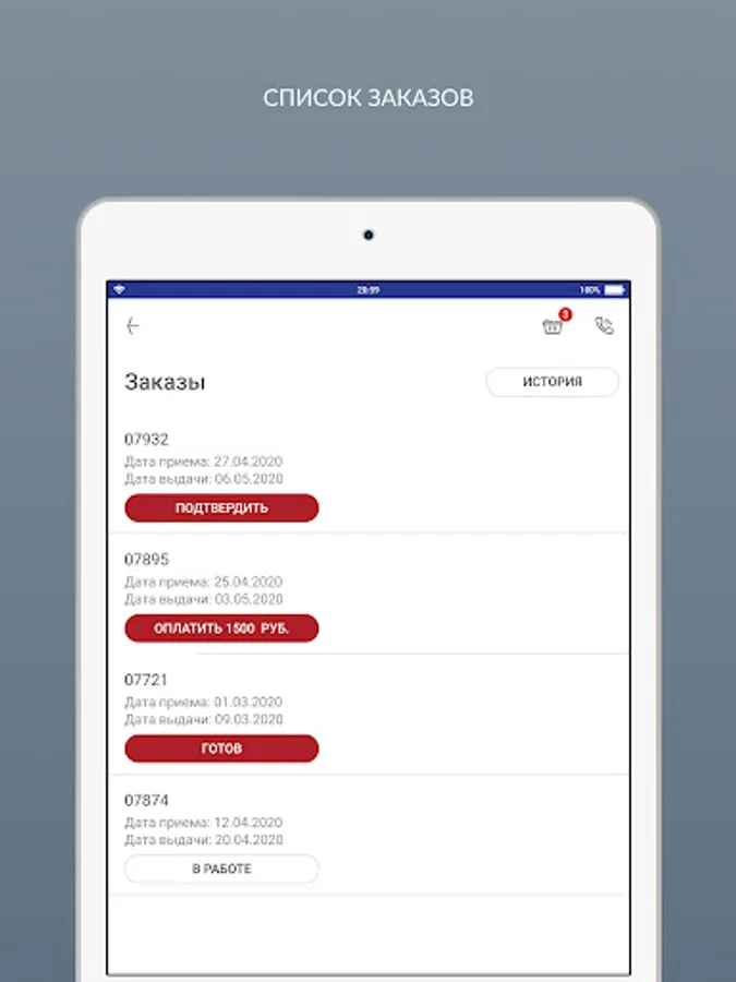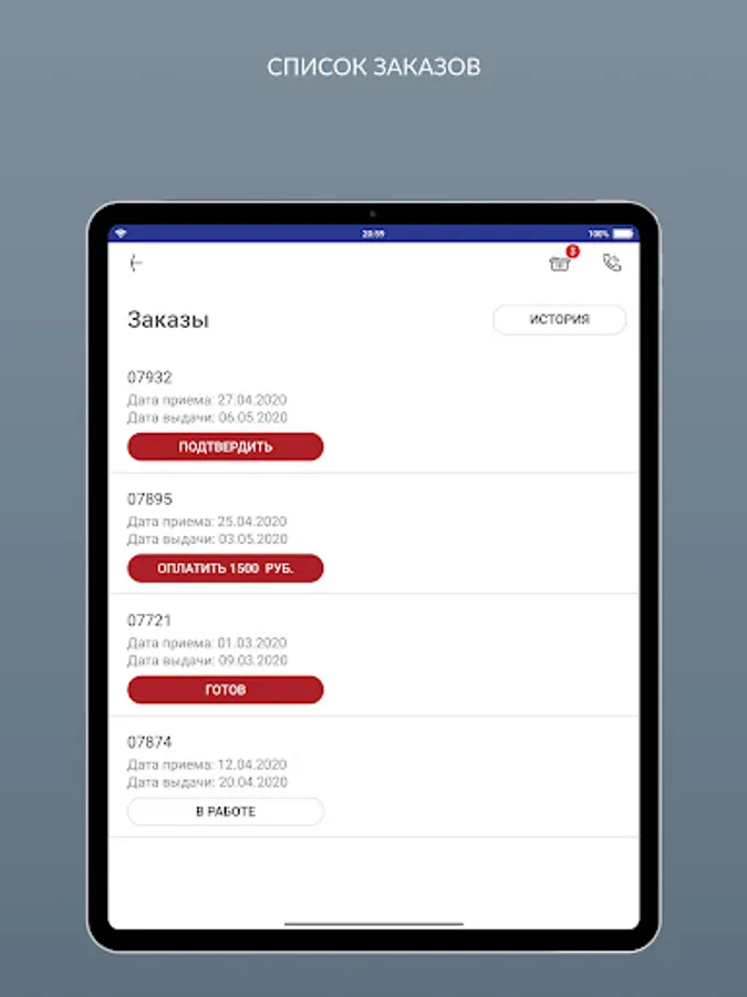 - view your orders in progress, their statuses, order history;