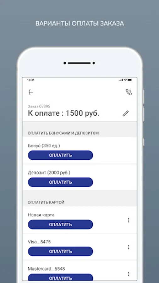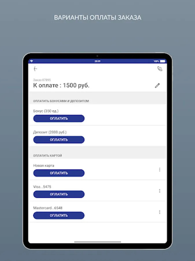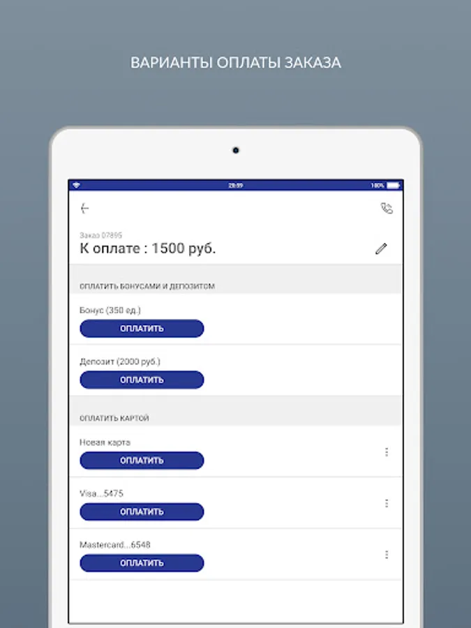 - pay for orders with a bank card, bonuses or a deposit;