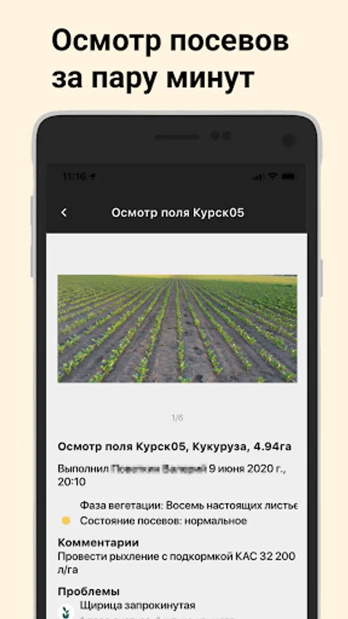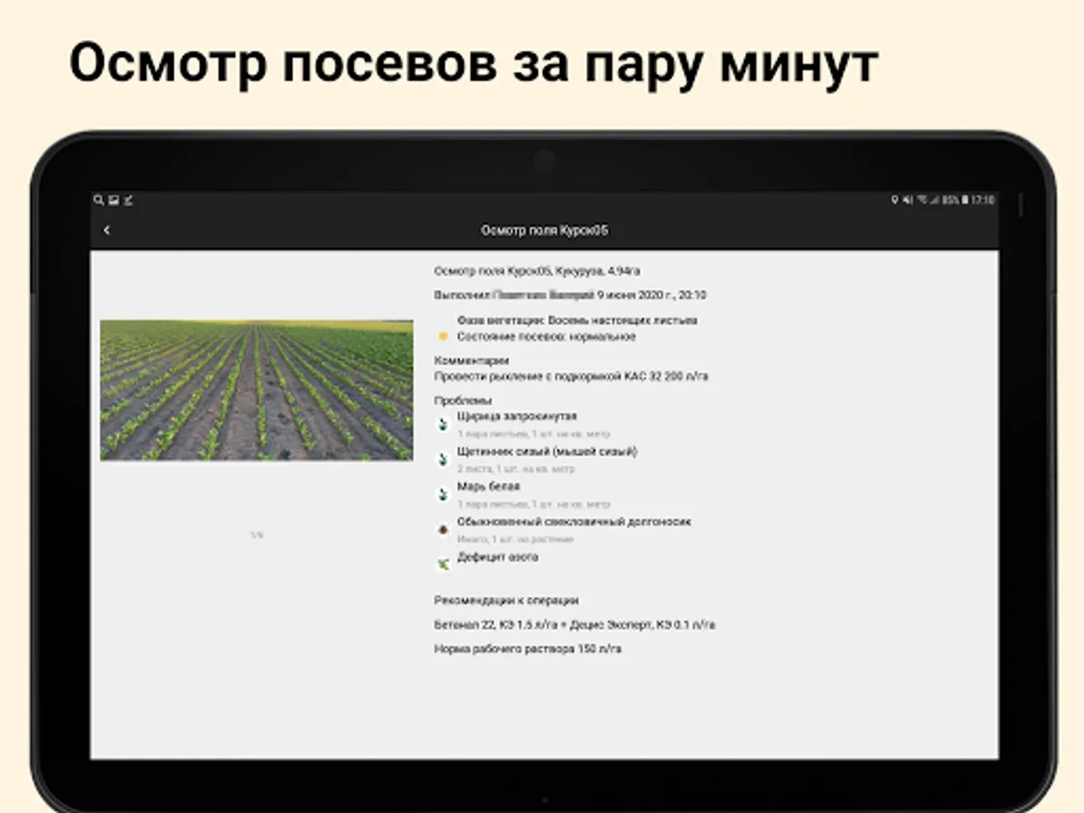 - Agroscouting - you can take photos on the field with georeferencing, easily select the growing season and problems from the reference books, issue recommendations, share the survey with colleagues