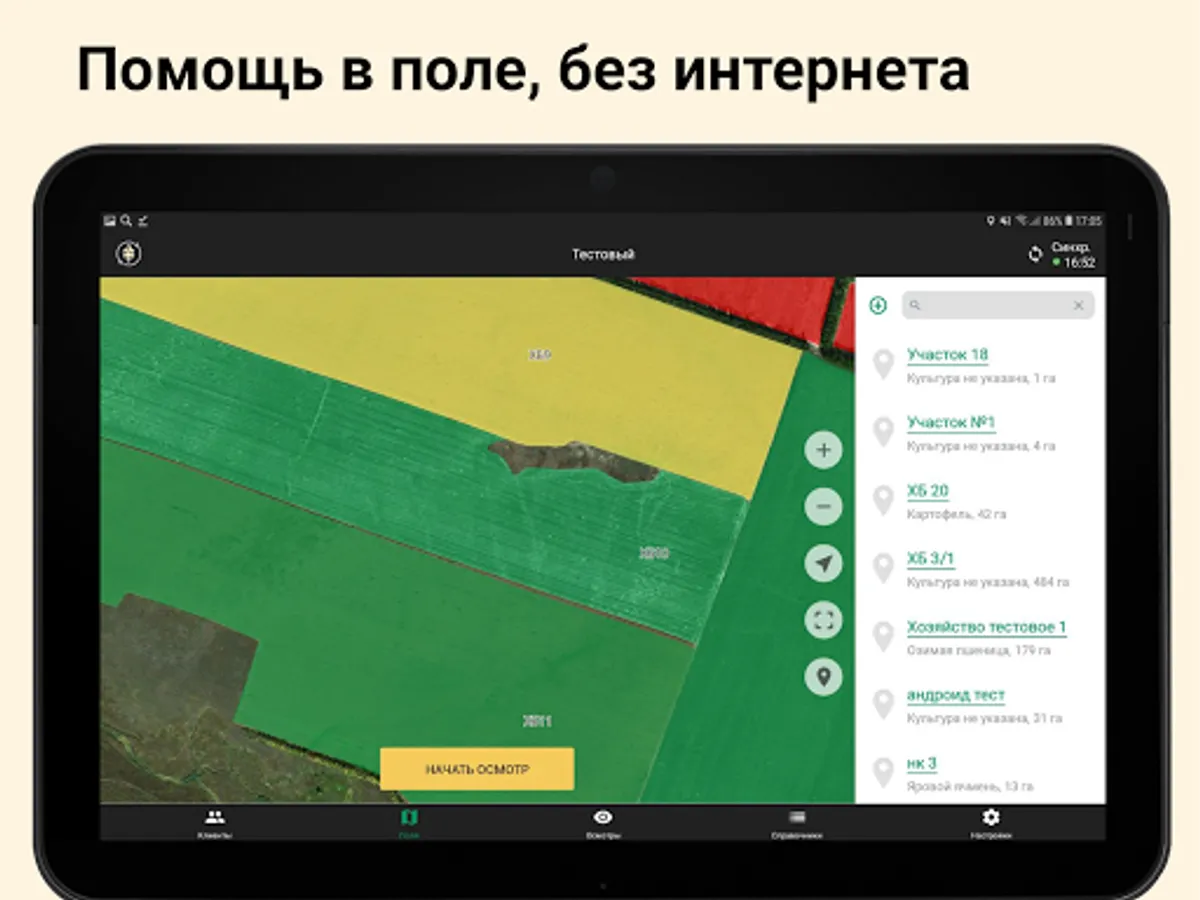 Be guided by the electronic map, record the state of crops while driving around the fields. Work history and agronomic reference books will always be at hand. The application works in the field without the Internet.
