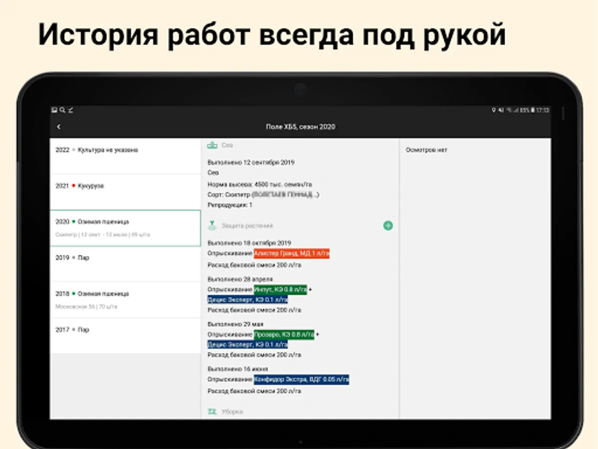 - History - crop rotation, completed and planned operations are always at hand. The story is divided into blocks - sowing, soil preparation, fertilization, plant protection, harvesting.