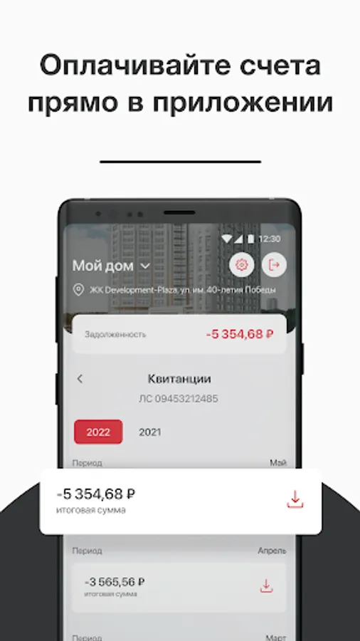 Inside you will find everything related to your apartment or facility that is under management: a store of premises, a marketplace where goods and services are available. As well as the services of the management company, common house and smart devices inside the apartment.