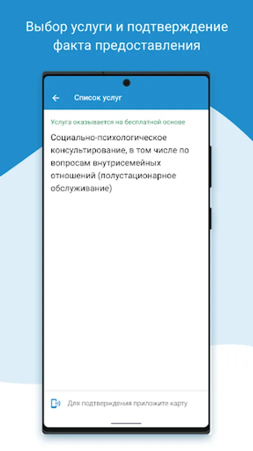 Social Services Provider - a mobile application for organizations providing social services to the population of the Yamalo-Nenets Autonomous Okrug using the Unified Card of a Resident of Yamal. The application will help organize the provision and accounting of social services in electronic form.