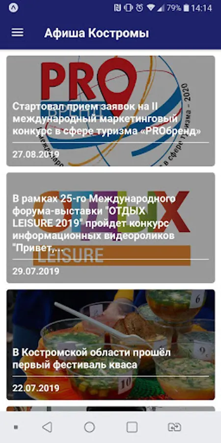The application of the Tourist Information Center of the Kostroma Region providing information and consulting services to Kostroma citizens, city guests and representatives of tourism industry entities. The mobile application displays the content of the portal kostromatravel.ru, information about events and a directory of organizations providing related services. This application allows users to register and receive push notifications with thematic news and events of the region, select convenient accommodation and catering options, book the most suitable place for the user to stay and choose a cafe or restaurant.