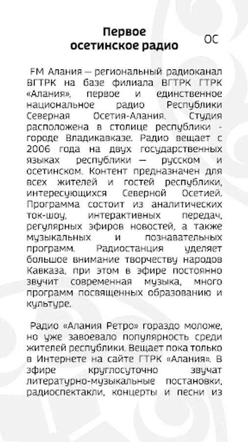 Radio Alania is an application in which two radio channels of North Ossetia are available around the clock.