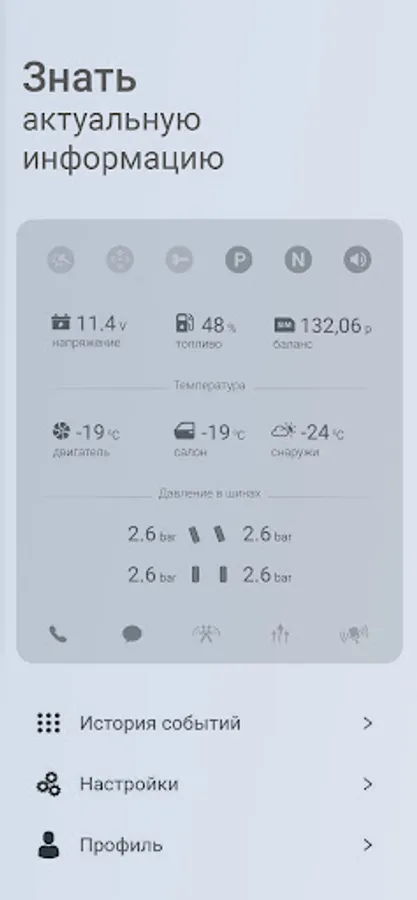 – Monitoring the current state of your car: statuses of all security zones and sensors, current fuel level (it depends on connections), engine temperature, car interior temperature, outside temperature (additional sensor is required), current car location (for systems with a GPS/GLONASS-receiver).