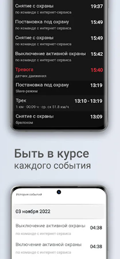 – History of events with coordinates, time and states of all security zones, sensors and other service information.
