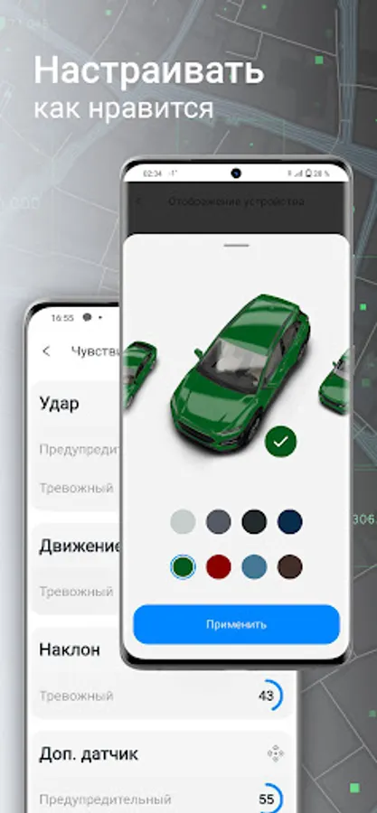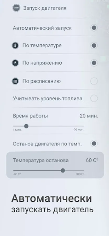 – Remote configuration of the main system parameters: sensors sensitivity, automatic engine start and stop parameters, original and aftermarket engine heaters operation parameters. Settings of alarm, service and emergency notifications
