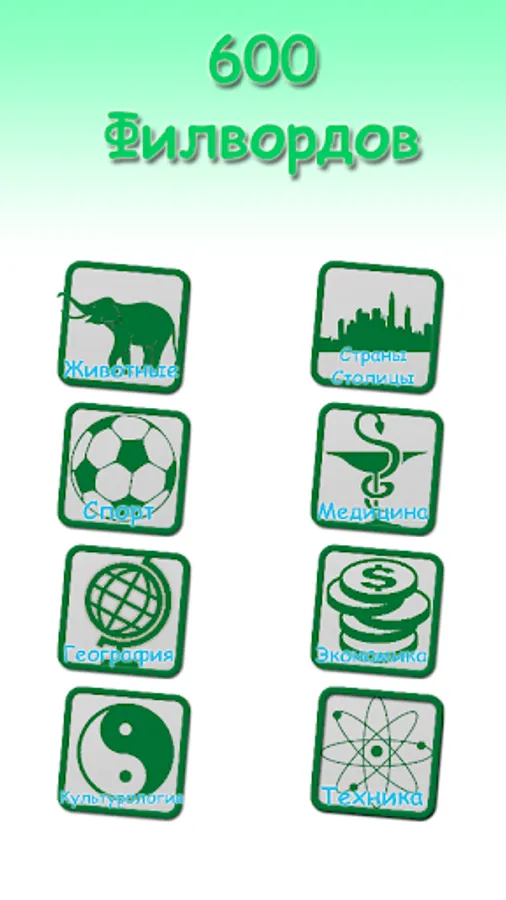Continuation of the game in 1000 Feelwords. The new part is collected about 3000 words, divided into 8 thematic categories: Animals, Countries and capitals, Sports, Medicine, Geography, Economics, Cultural Studies and Technology. All in the game collected 600 original levels.