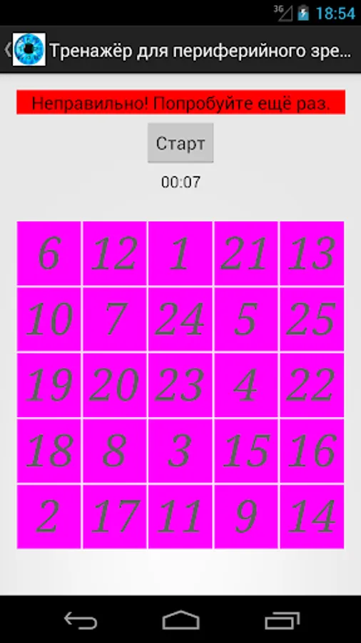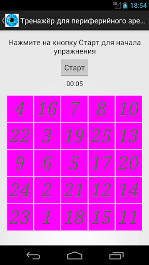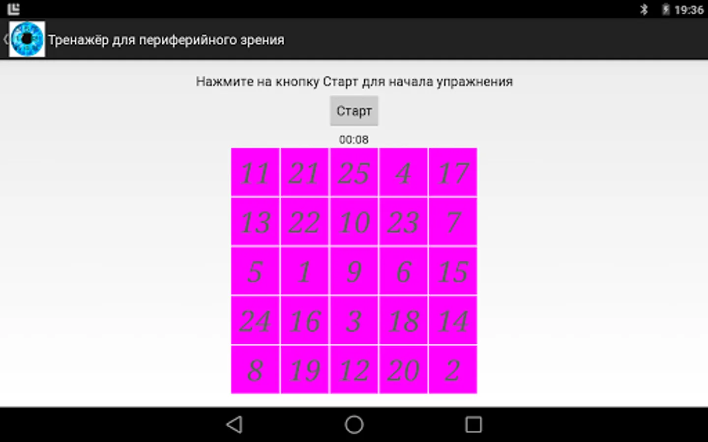 Application for the development of peripheral vision with the help of tables Schulte. Currently there are no options and bells and whistles. For reference.