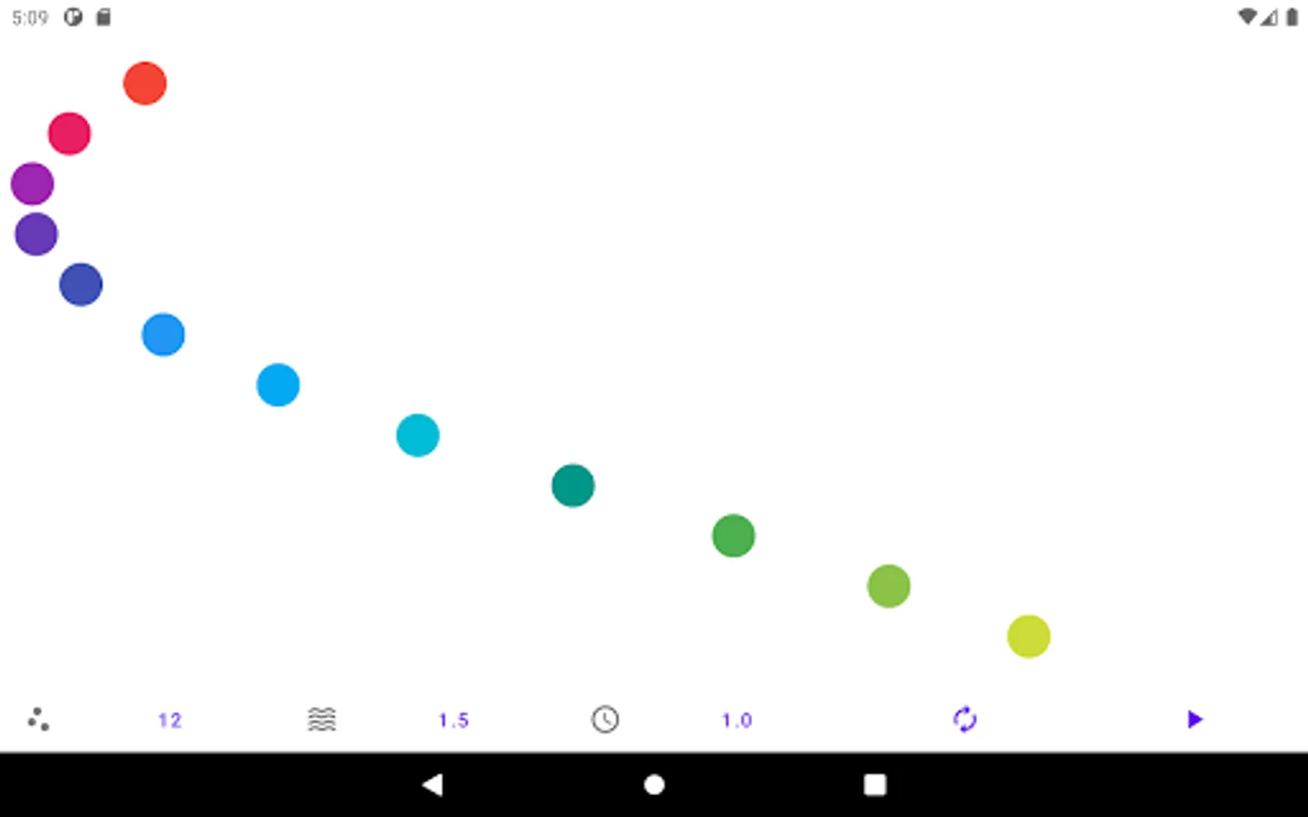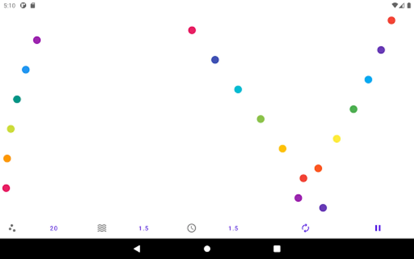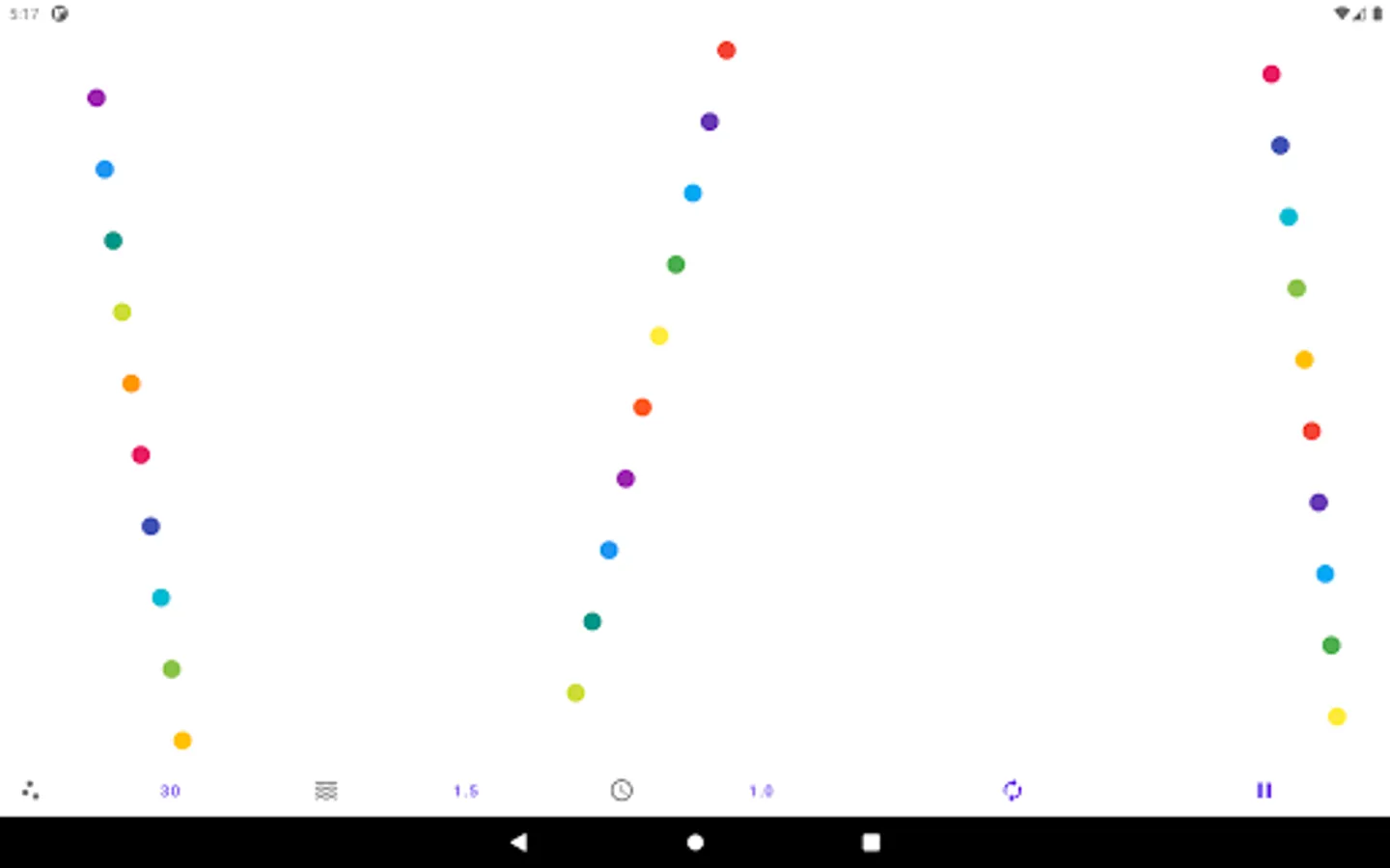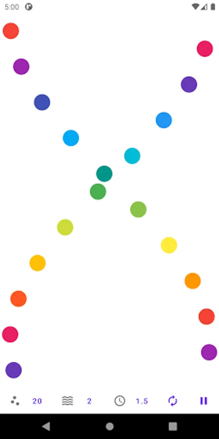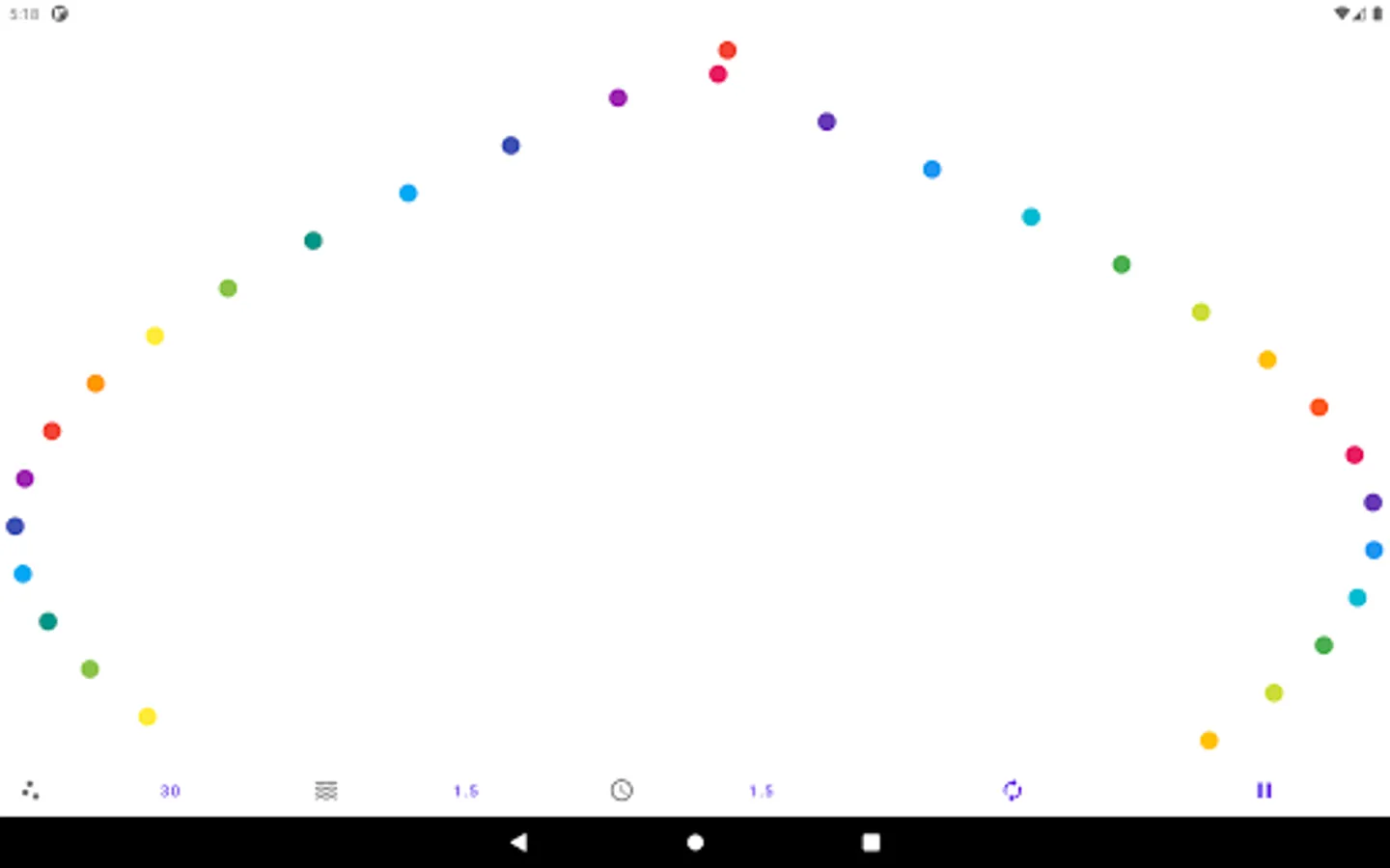 Each pendulum has slightly longer period than it's previous neighbor. Play with the number of pendulums, period delta, and time scale, and observe the emerging motion patterns.
