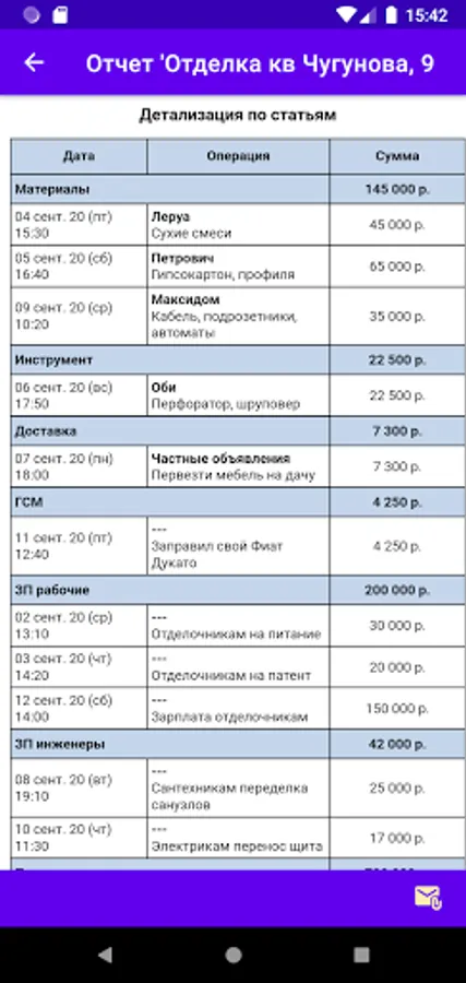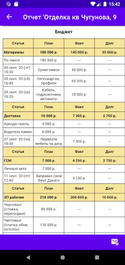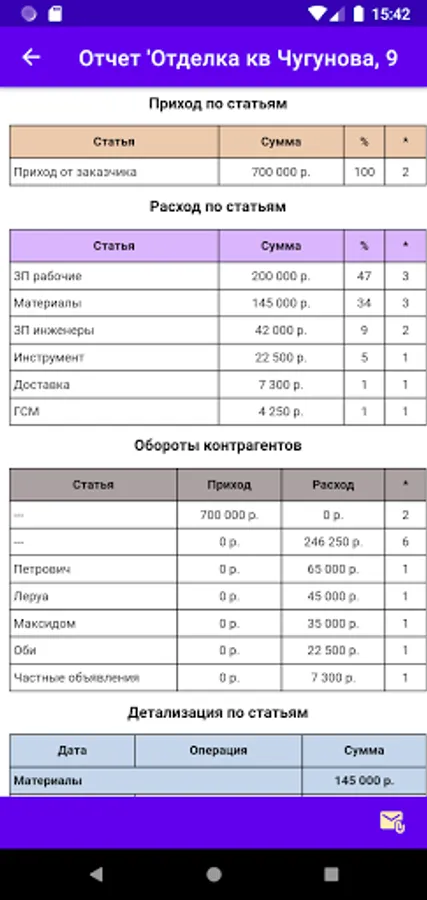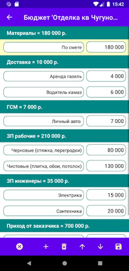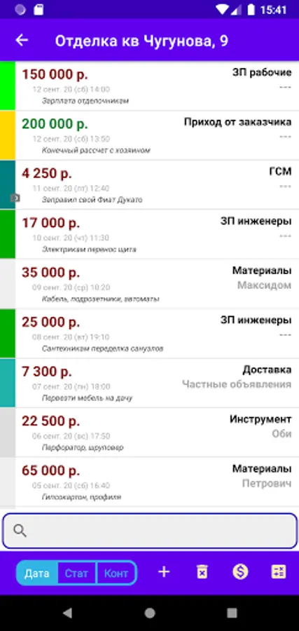 StroBuh is an accounting program for a smartphone for foremen who independently manage their objects. Estimates, settlements with the customer, purchase of materials and tools, rental of special equipment, transportation costs, third-party services, payment of wages to workers - all operations are entered into StroBuh on the fly in a smartphone. A computer with Excel and 1c is no longer needed. There is no need to put checks into reports in the evening after work. At any given time, you know the financial condition of your properties. You see - you are making money from them or are already losing. Budget expenses. Record the experience.