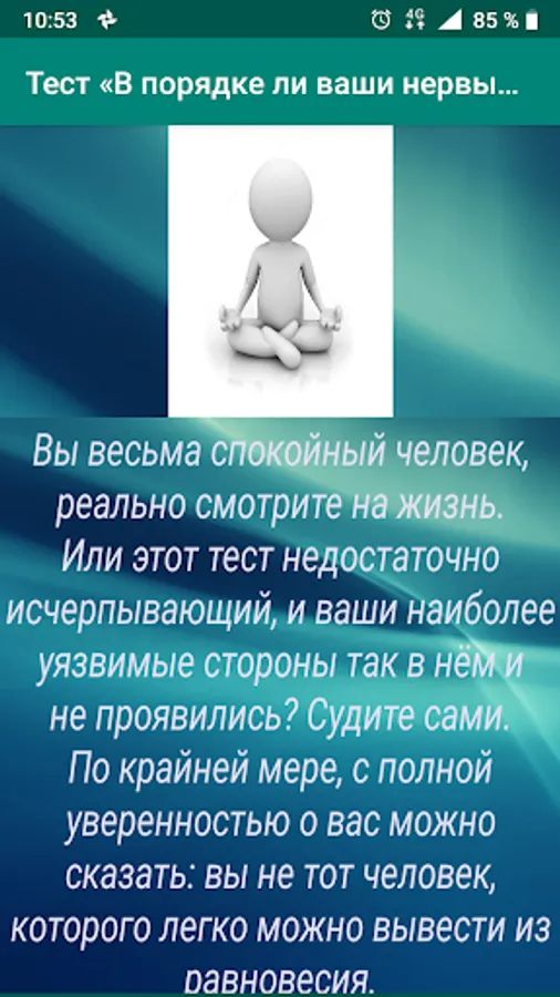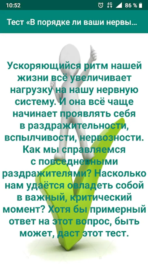 The accelerating rhythm of our life all increases the load on our nervous system. And it is increasingly beginning to manifest itself in irritability, temper, nervousness ... How do we cope with everyday irritants? How much do we manage to master ourselves at an important, critical moment? At least an approximate answer to this question, perhaps, will give this test.