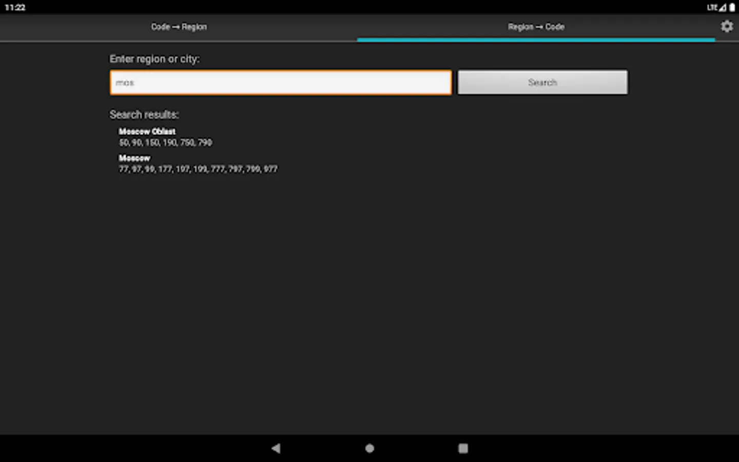 You can also find all codes assigned to a region or a city. If you enter «Moscow» the app will display the list of codes on cars in Moscow.