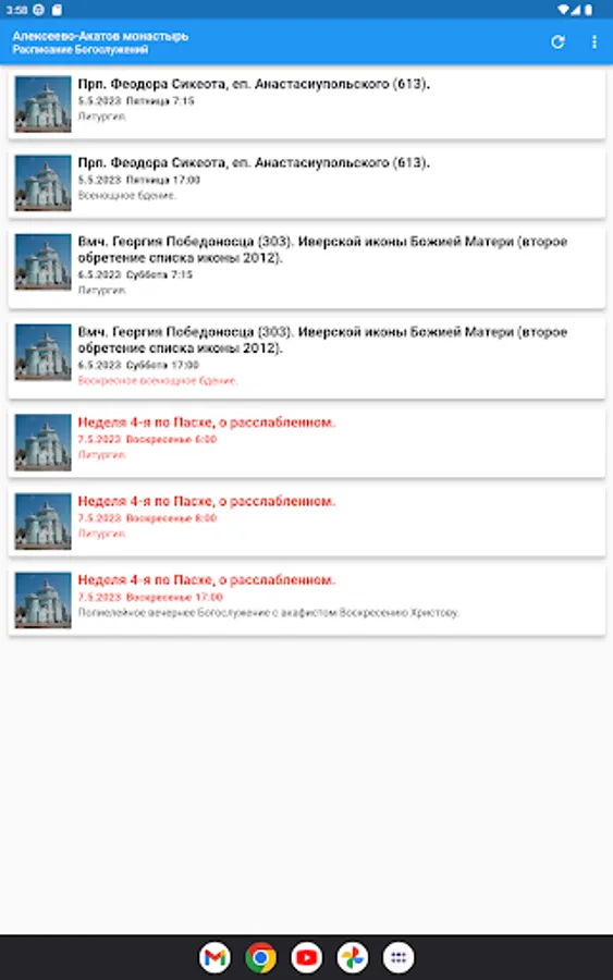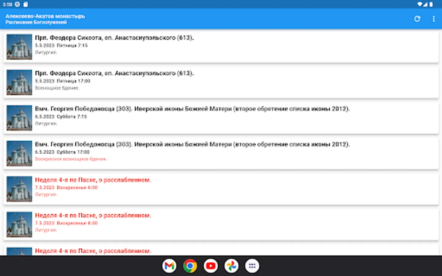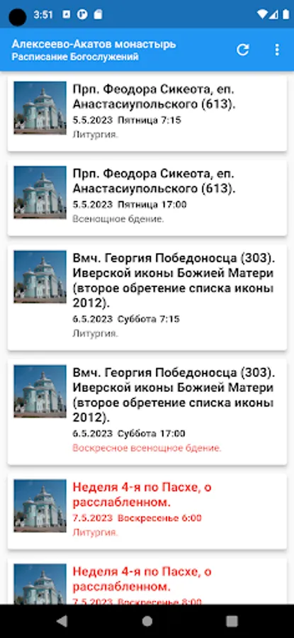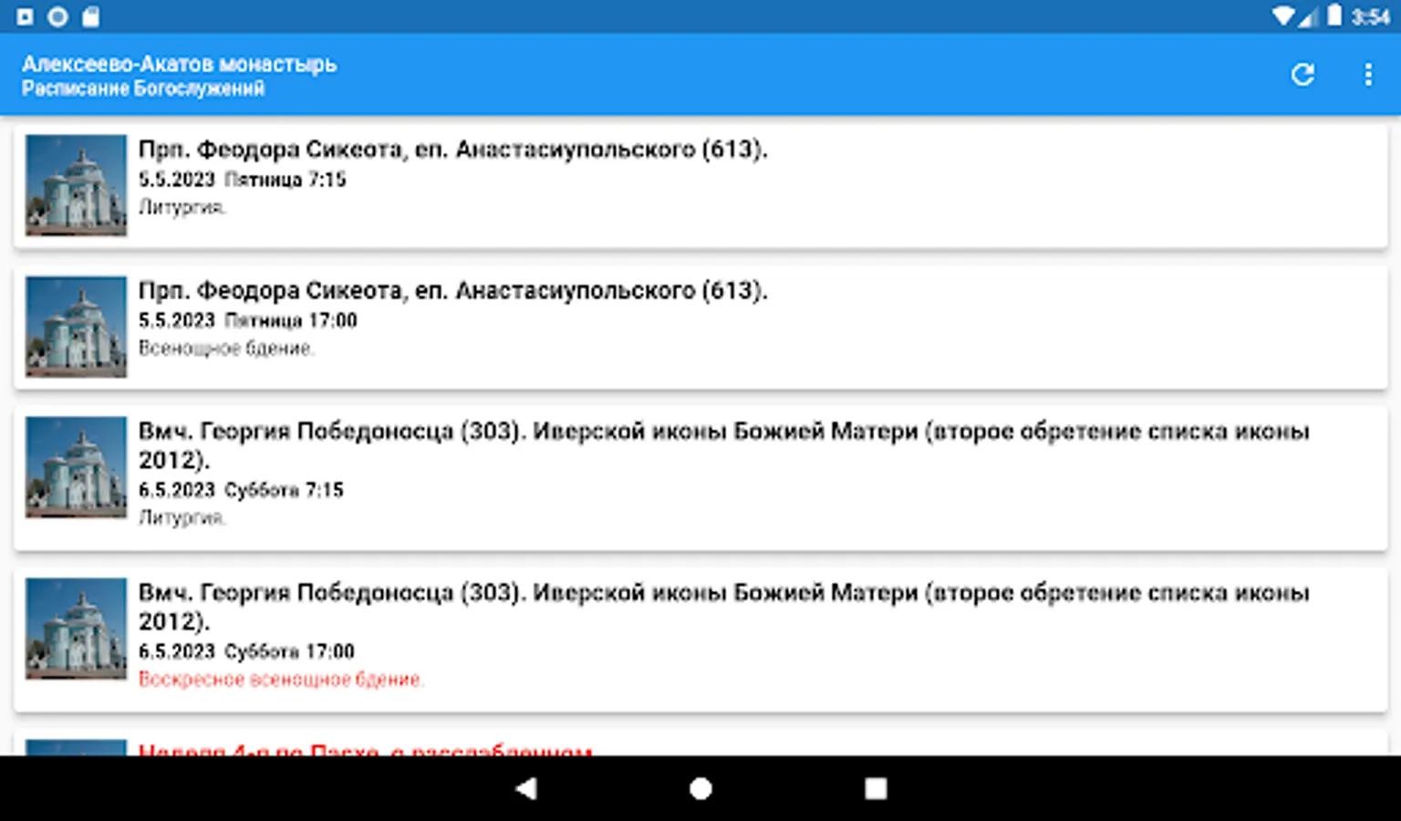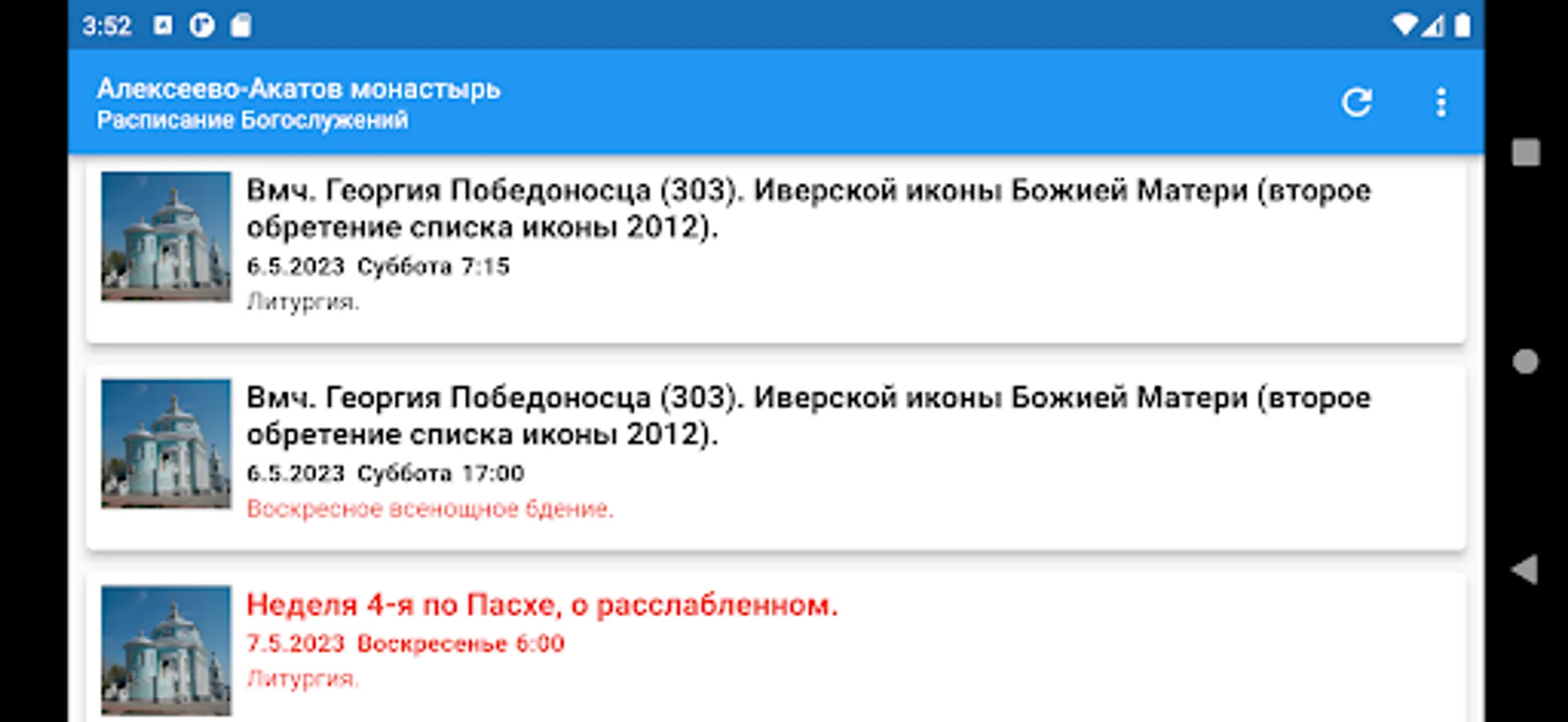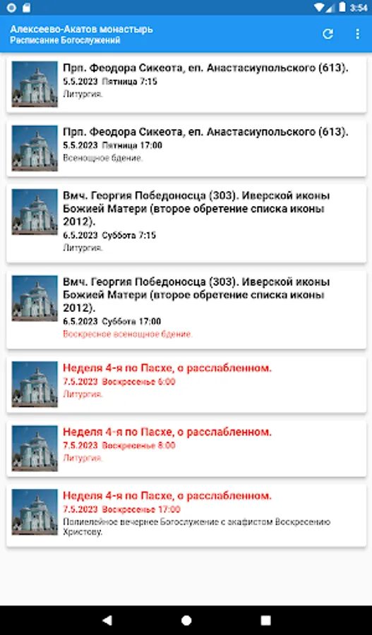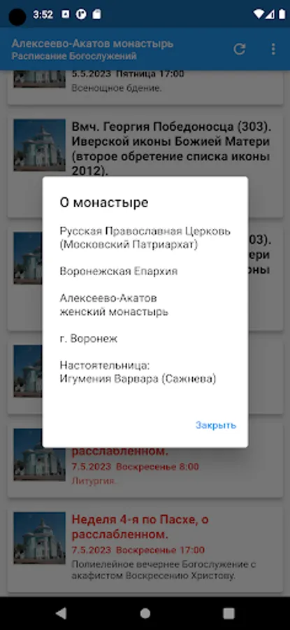 The mobile application allows you to receive the schedule of Divine Services of the Alekseev-Akatov Monastery in Voronezh, Voronezh Diocese of the Moscow Patriarchate of the Russian Orthodox Church. Internet connection required.