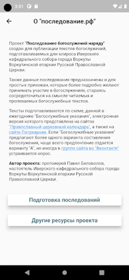 1. Follow-up of Divine Services on the website of the project "Follow-up of Divine Services" at the address "https://follow-up.rf", prepared for the choir of the Iversky Cathedral in the city of Vorkuta, Vorkuta Diocese of the Russian Orthodox Church.