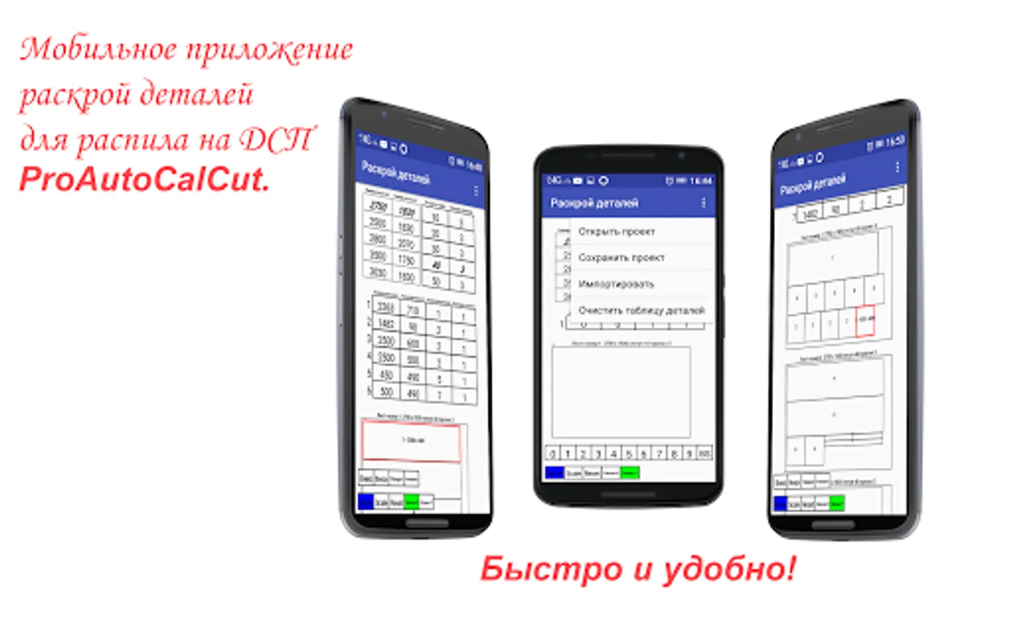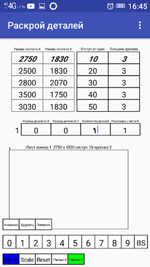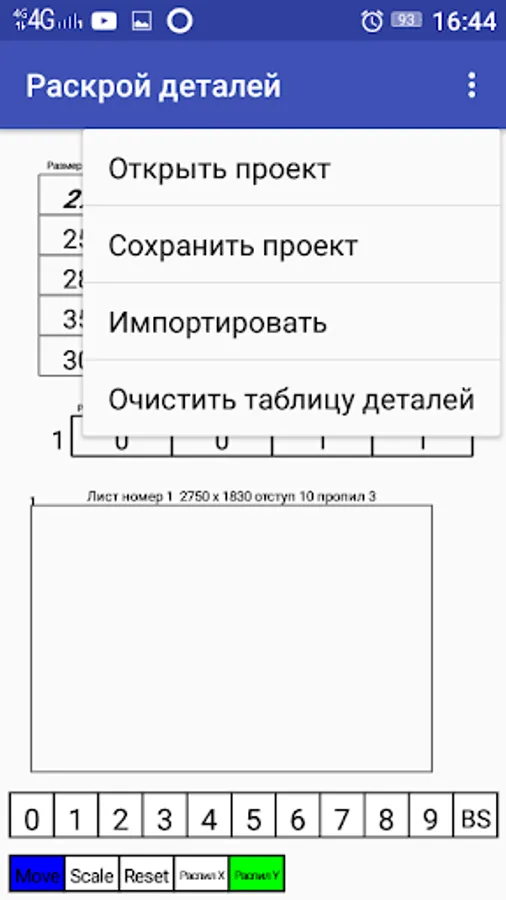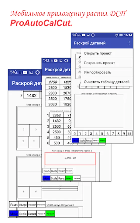 In the mobile application, the cutting editor ProAutoCalCut can be opened, the previously saved project of cutting the details with the operation “Open project”. You can save the nesting project using the Save Project operation. Using the operation "Import" you can download a file a copy of the project