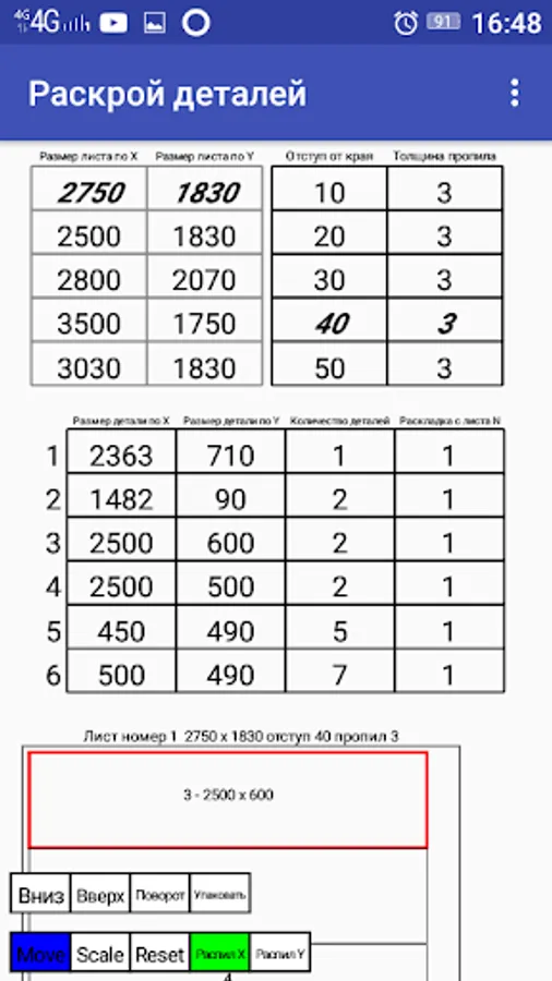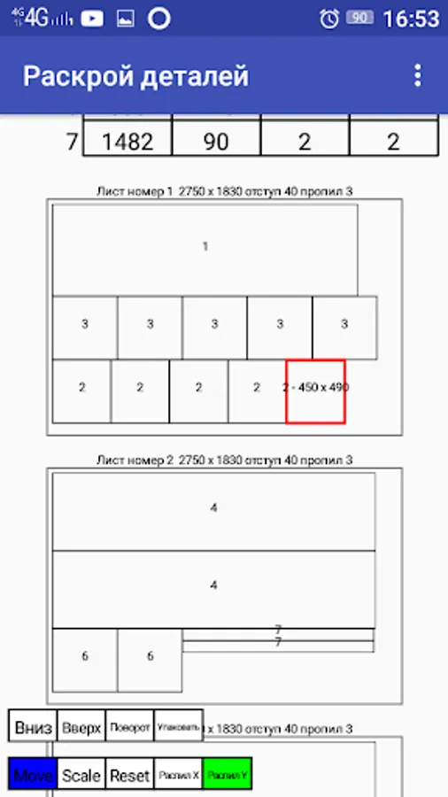 After importing the project of the wardrobe from the ProAutoKupe mobile application, to do this, select the name of the project of the cabinet and select the operation in the top “Import”. The screen will display a table of cabinet details - the compartment, their dimensions, the number and the value of the number of chipboard sheets - “Layout from sheet N”, from which the initial layout of parts of the cabinet originates. By selecting the details of the cabinet on the screen using the commands "Up", "Down" you can move the parts along the chipboard. Rotate parts using the “Rotate” command, using the “Cut X”, “Cut Y” commands to arrange the cabinet parts along the X or Y axis. To reduce the size of the detail table, the “Pack” command groups all parts with the same dimensions into one line indicating the number of such parts .