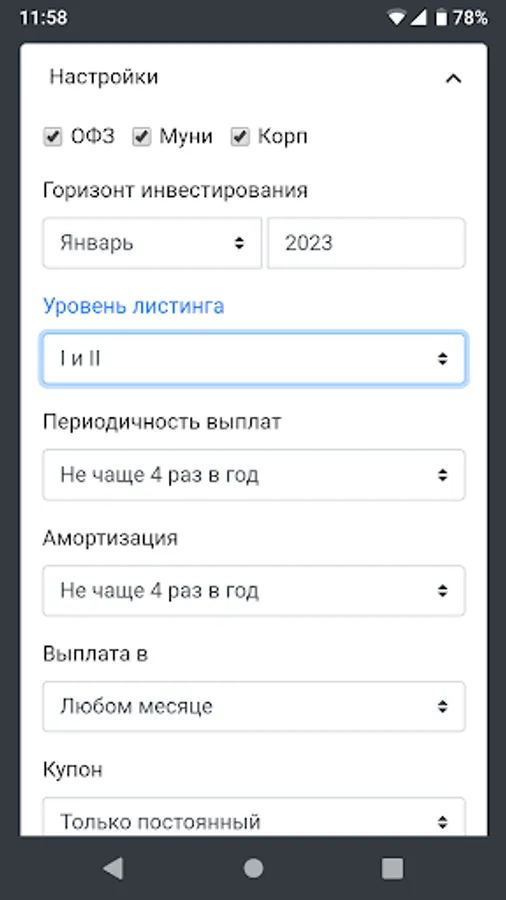 Instant filter by type of issuer, maturity date, listing level, frequency of payments, availability of the offer.